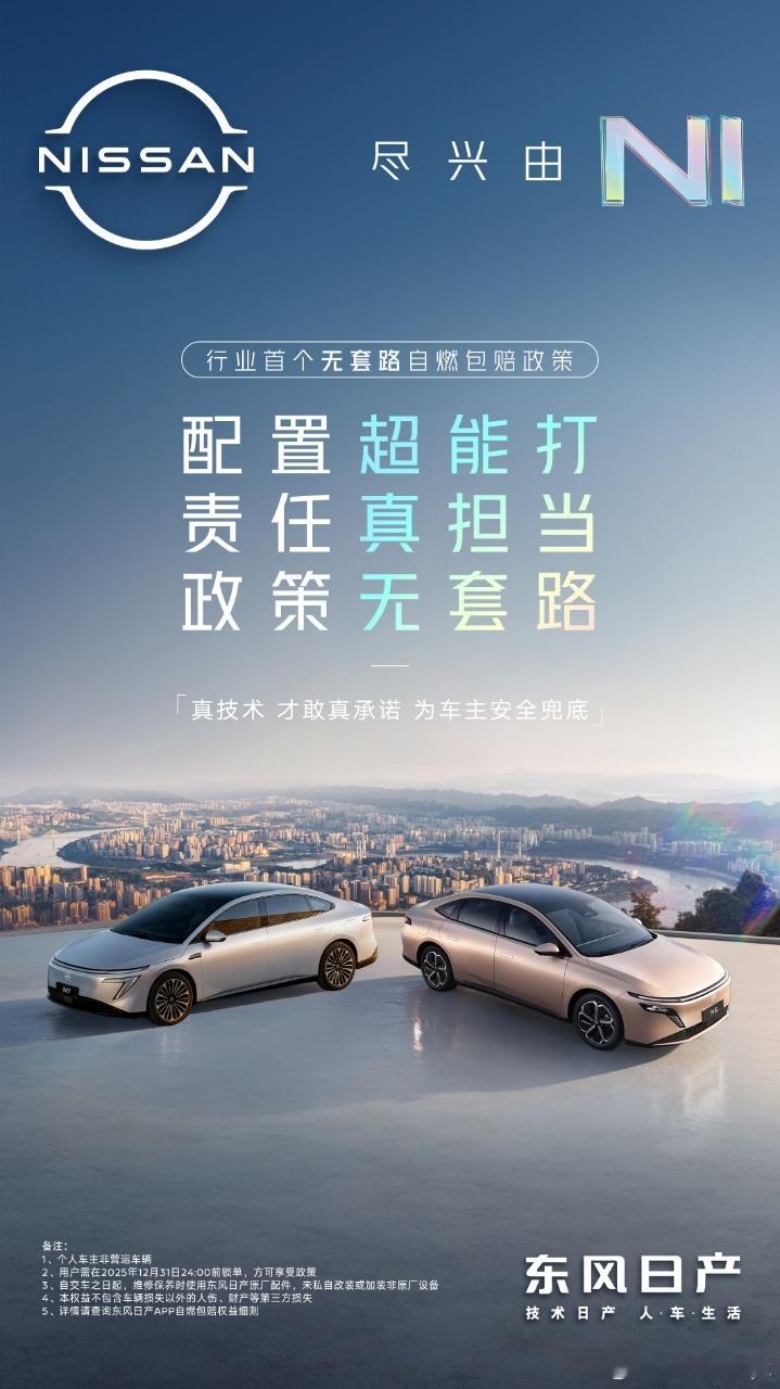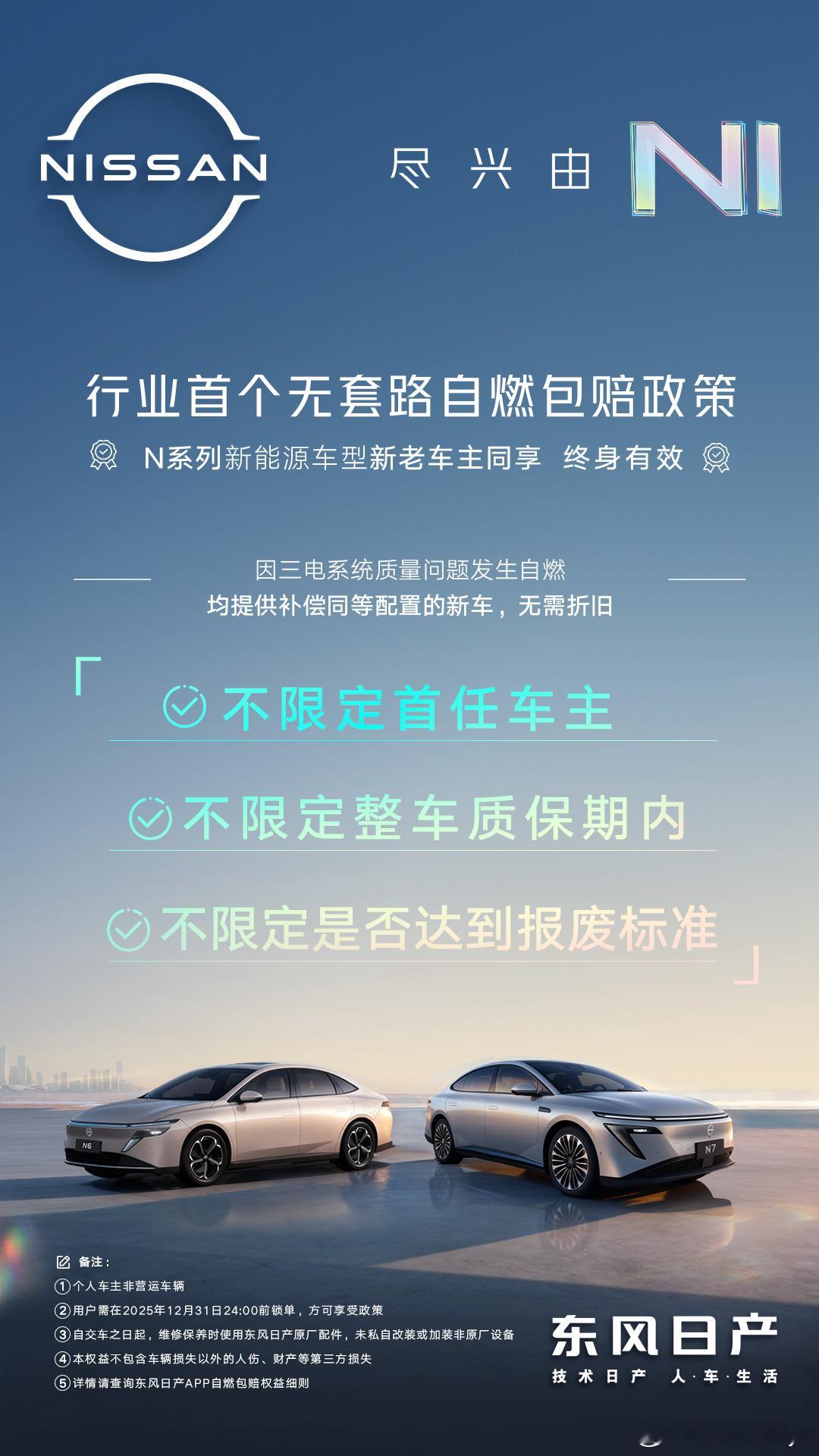 东风日产推出行业首个无套路自燃包赔政策👍🛡️ N系列新能源车型新老车主同享,终身有效🔋因三电系统质量问题发生自燃,均提供补偿同等配置的新车,无需折旧✅ 不限定首任车主✅ 不限定整车质保期内✅ 不限定是否达到