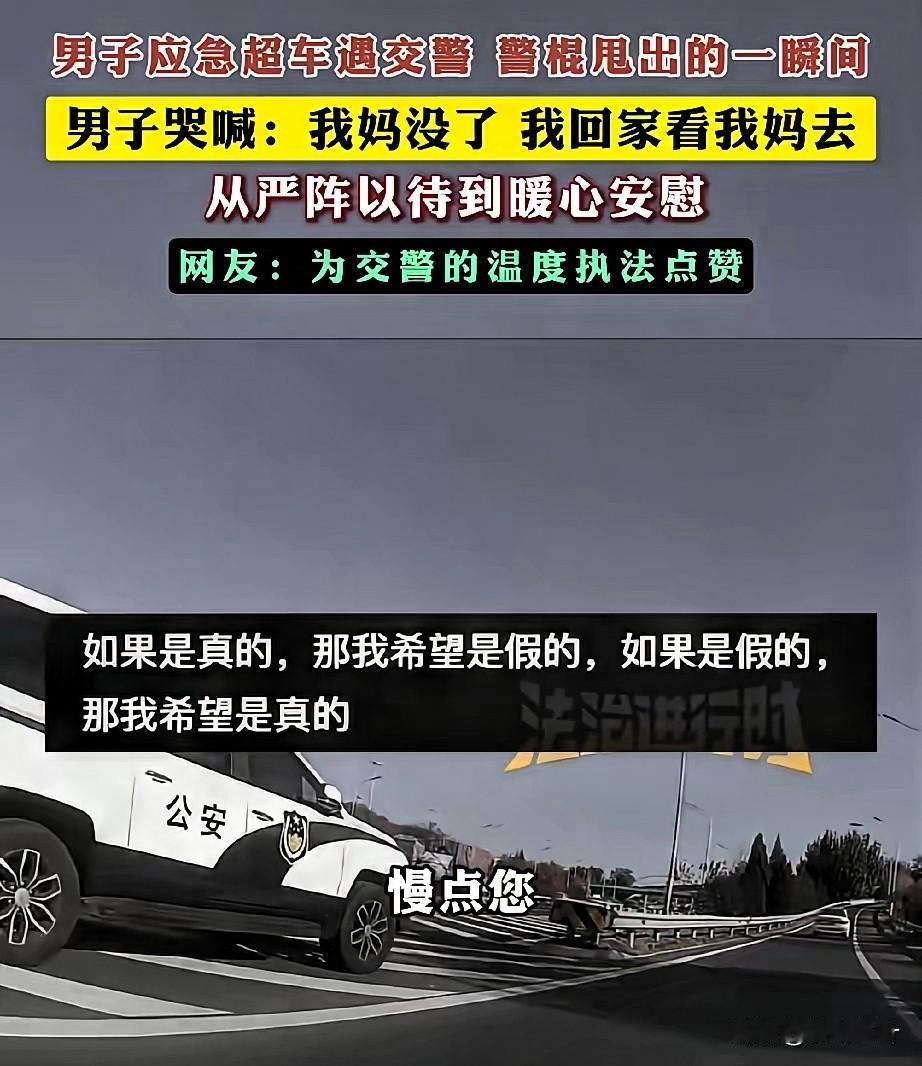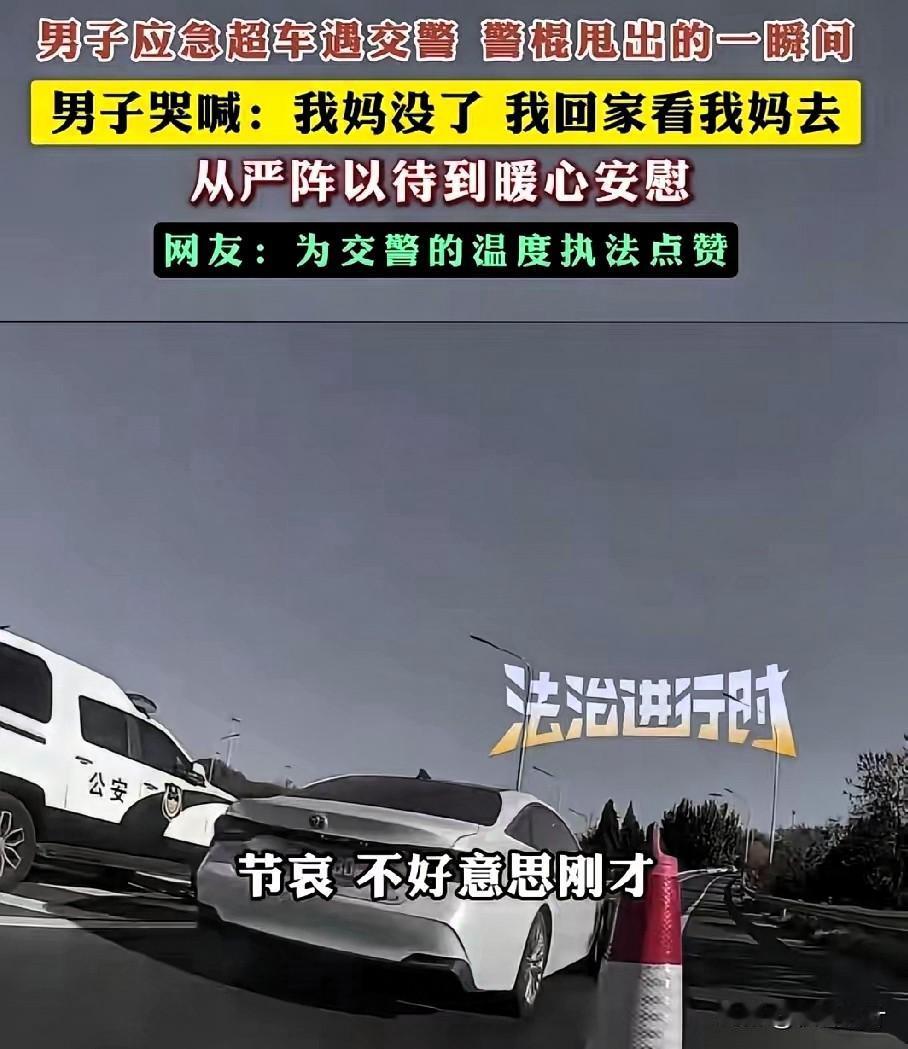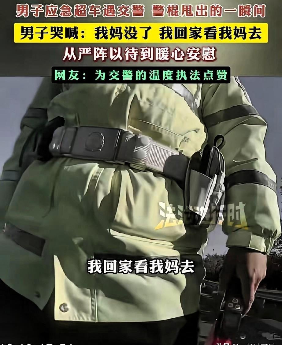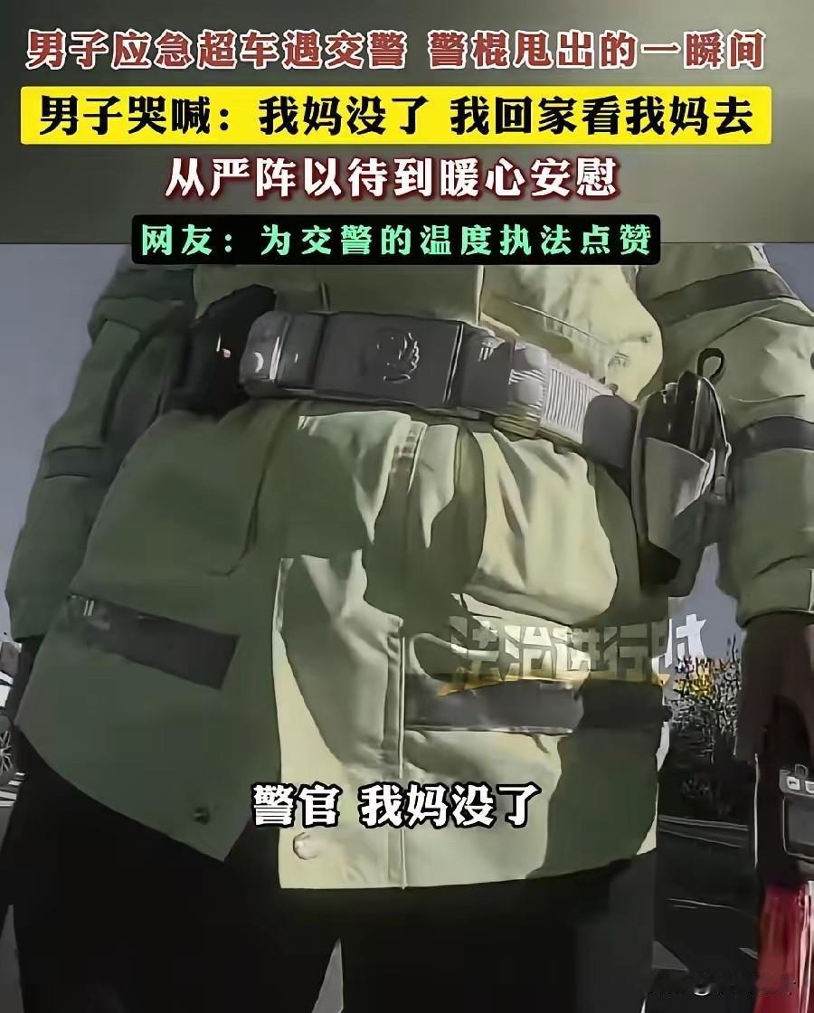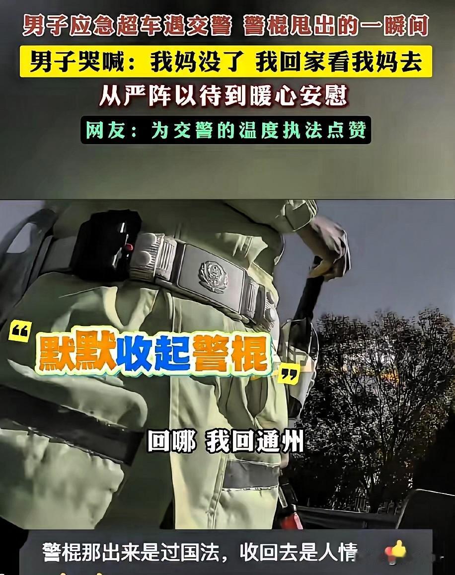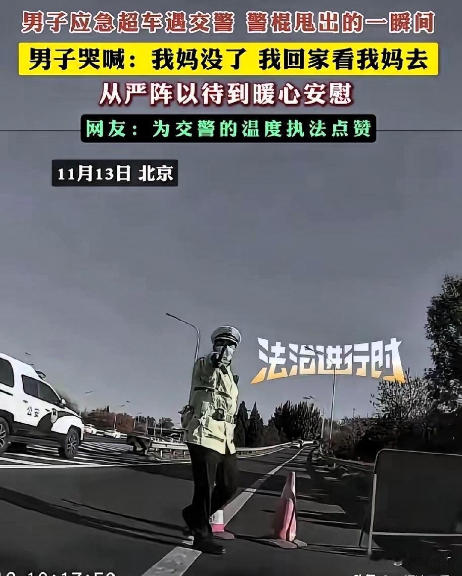 真是太暖心了!北京交警这波操作看哭全网,规则之内是底线,之外是人心 刷到北京街头这段视频时,原来真正的执法,从不是冷冰冰的约束,而是懂百姓疾苦的温柔以待,这才是人民群众最需要的安全感。 视频里,一名男子驾车时紧急超车,被执勤交警当场拦下。就在交警拿出警棍准备进一步处置的瞬间,男子突然情绪崩溃,趴在方向盘上撕心裂肺哭喊:“警官,我妈没了!我得赶紧回通州,见我妈最后一面啊!” 那哭声里的绝望与急切,没有丝毫伪装,每一声都戳中人心,隔着屏幕都能感受到他的煎熬——谁都懂,这种时候,多耽误一分钟都可能留下终生遗憾。 让人瞬间破防的是交警的反应。他没有半句追问,立刻默默收起警棍,眼神里满是理解与心疼。他先轻声问清目的地,随即拿起对讲机快速通报:“这里有特殊情况,当事人奔丧急需返乡,准予放行,请沿途留意配合!” 通报完,交警没有急着让男子离开,反而走到车窗边耐心安慰:“兄弟,路上慢点开,安全第一,节哀顺变。刚才拦下你多有冒犯,别往心里去。” 简单几句话,像一股暖流,瞬间抚平了男子的慌乱与委屈。男子哽咽着连声道谢,缓缓驾车离去,奔赴那个承载着最后牵挂的家。 中国人最懂“子欲养而亲不待”的痛,也最怕深夜里突如其来的离别消息。执法的初衷是守护秩序,而不是不近人情地为难。这位交警用行动诠释了:规则是底线,人心是温度,严格执法和人文关怀从来都不冲突。 这样体恤百姓急难愁盼的人民警察,才是真正的“人民卫士”,值得全网狠狠点赞!