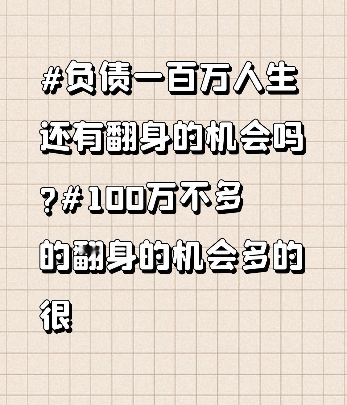 负债一百万人生还有翻身的机会吗? 负债一百万,人生绝对有翻身机会!负债并非绝境,而是个“加速器”,能压垮人,也能逼你爆发。 我认识的老张,餐饮赔了150万,变卖设备得30万,去搞社区团购,三个月流水20万。负债时要盘点能变现的东西,车、表、闲置房产,甚至知识技能都行,还要砍掉非必要支出。别舍不得变卖资产,这不是认输,而是断臂求生。像有人低价卖收藏球鞋回血当启动资金。 也别盲目信网络“一夜发财”的说法,可团结家人一起面对。只要有决心和行动,翻身就在前方! 启动资金最关键了