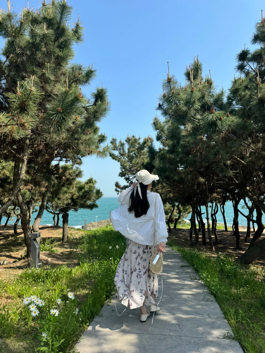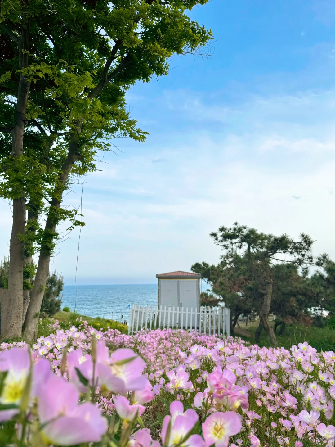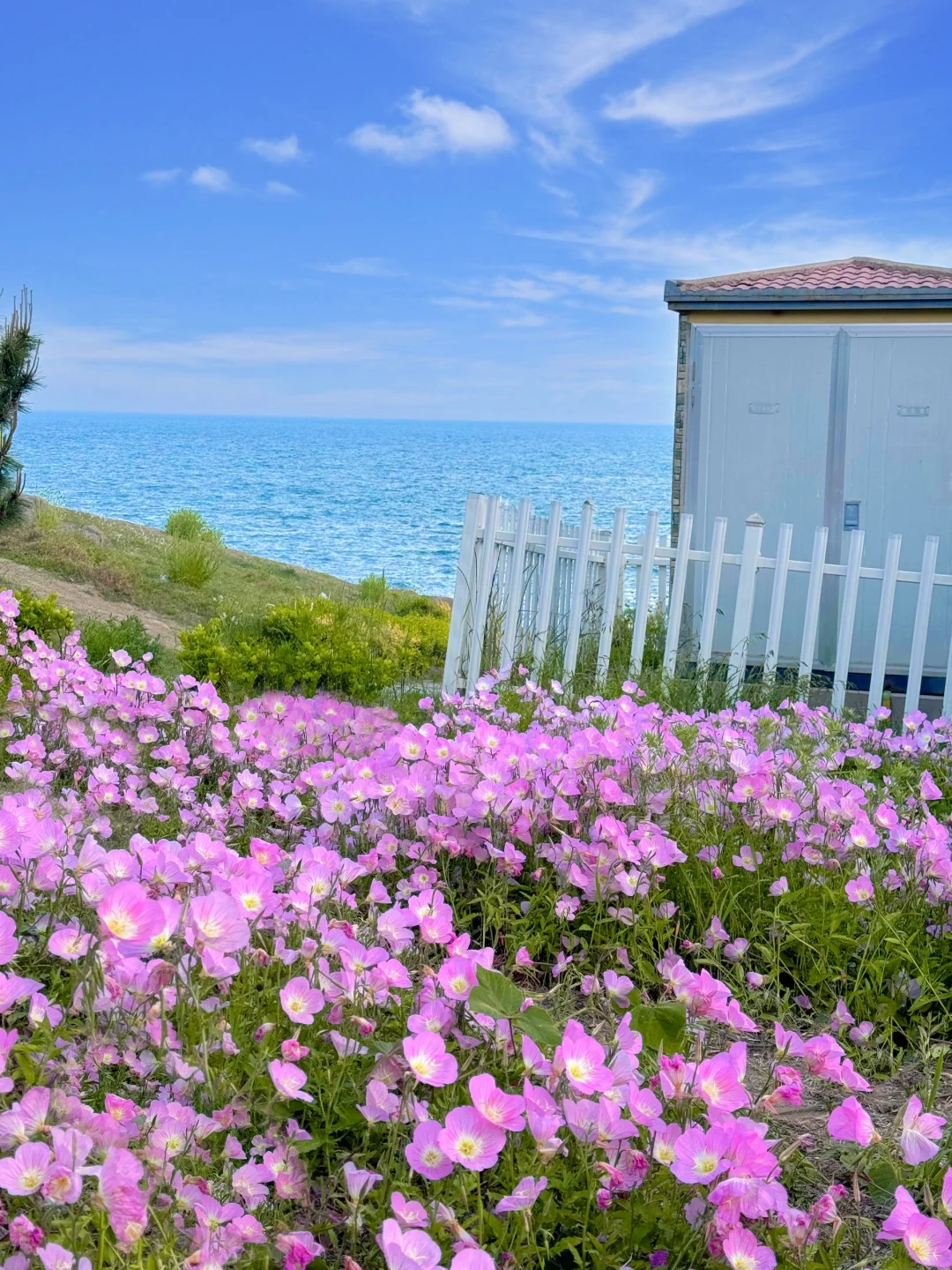 4️⃣大房子咖啡:从连三岛一直往前,到西环岛7号停车场,9号停车场有小粉花和通往大海的石子路,右侧有很多海边蔷薇花,这一路都超美