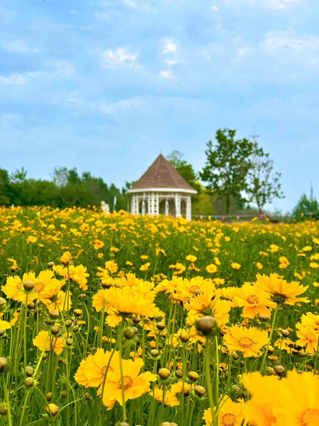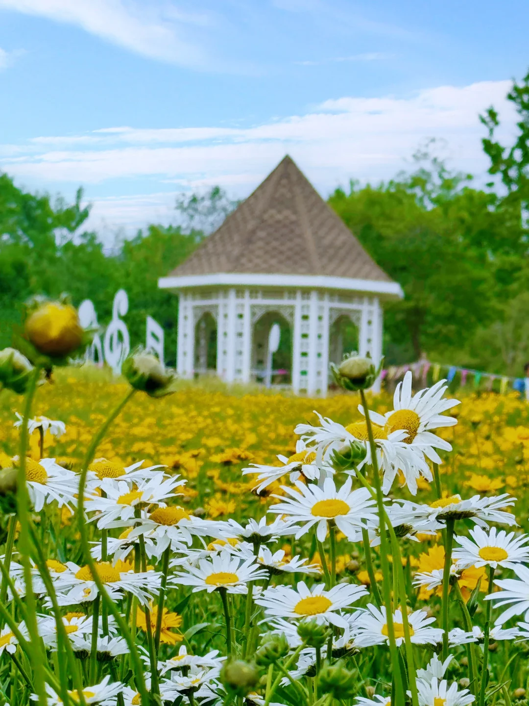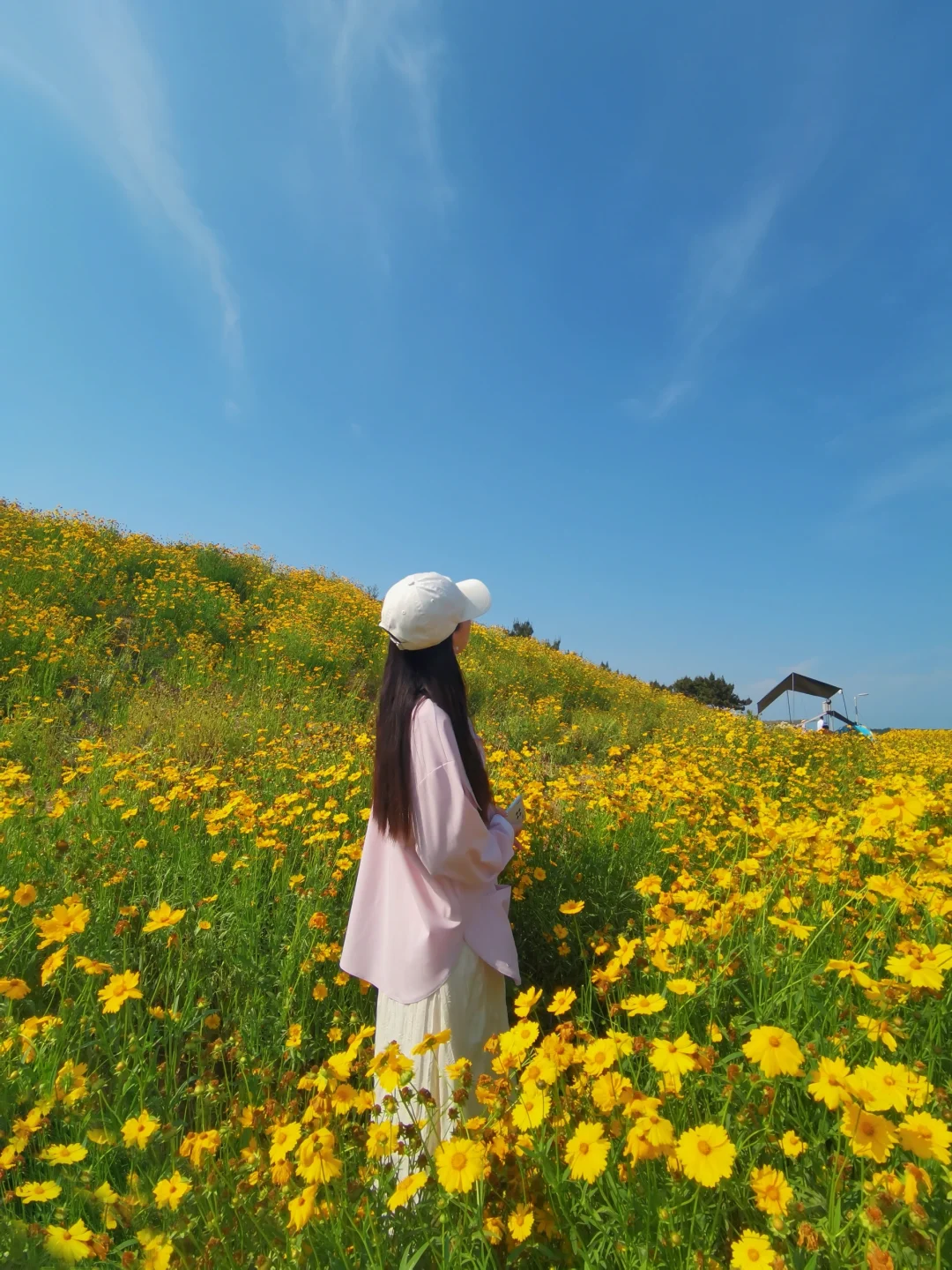 1️⃣唐岛湾湿地公园:先导航3号门,公交50路直达,自驾2h停车免费🆓,入园再导航“荷兰风车”,有一大片大金菊花,已经开花啦可放心前往!白色小雏菊和草房子在荷兰风车西南300米左右,沿着海边一直往里走即可