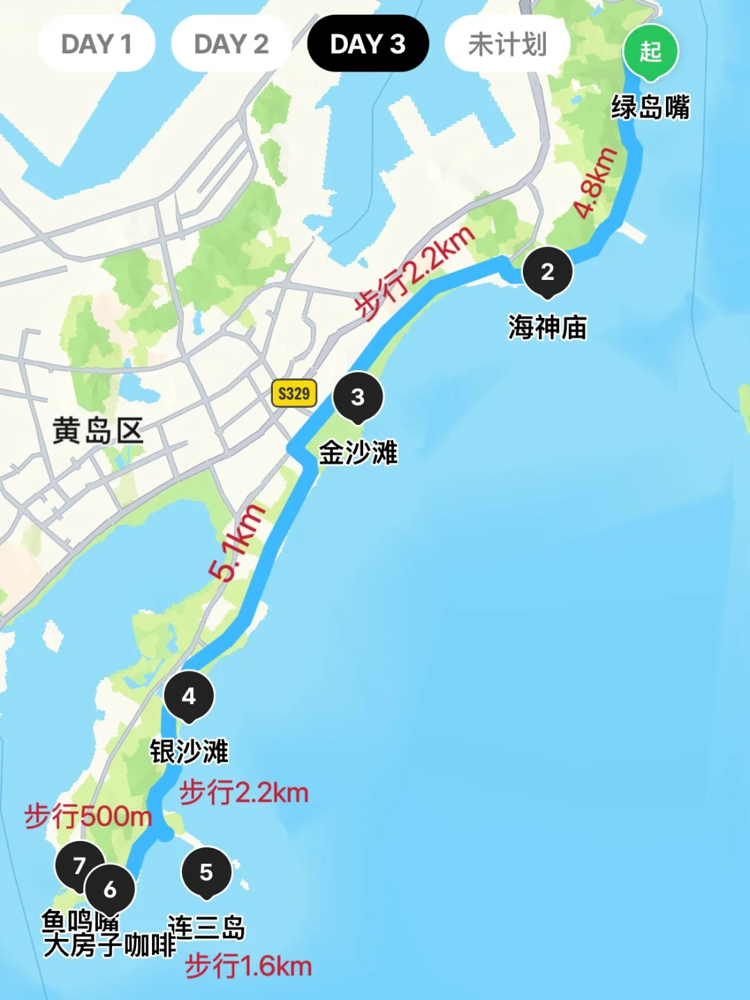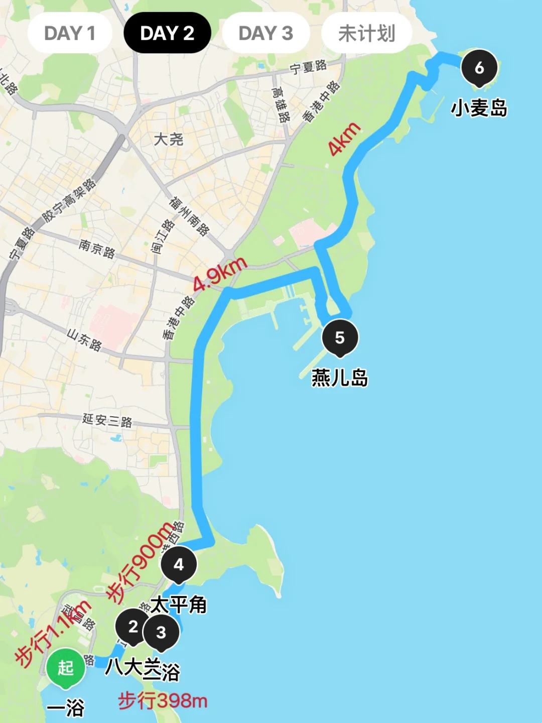 一浴➠八大关➠二浴➠太平角公园➠燕儿岛➠小麦岛