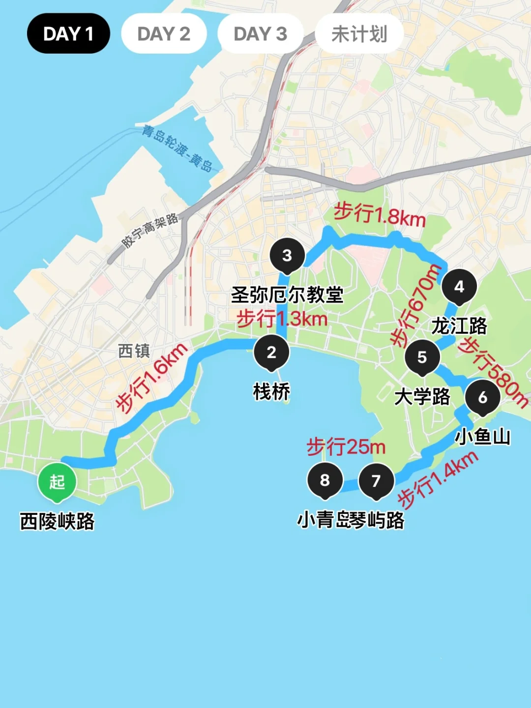 西陵峡三路➠西陵峡一路➠栈桥➠圣弥厄尔大教堂➠龙江路➠大学路➠福山支路➠小鱼山➠琴屿路➠小青岛