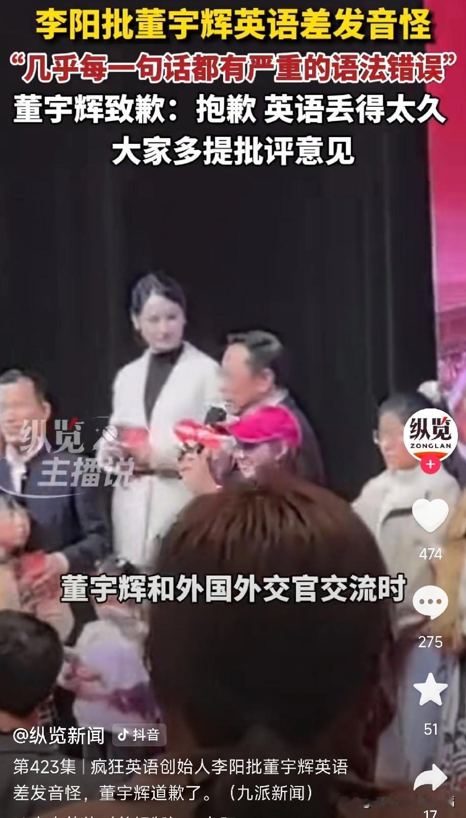 董宇辉犯了很严重的英语语法错误。 董宇辉特意发文道歉,董宇辉很在意李阳的批评,毕竟自己是专业的英语老师。 不过人哪有十全十美,再厉害的人不是神仙,样样都能得到,人的精力毕竟是有限的。 在这人世间,你我皆凡人,凡人没有腾云驾雾的本领,却在三餐四季的流转中,种出了欢喜与感动。凡人在平凡的世界中守着烟火温情,只觉得人间值得! 欣赏李阳老师的专业能力,语法知识功底深厚,就连董宇辉与嘉宾的互动都能用语法去评判董宇辉的英语水平,李阳老师真的是一名合格的英语老师,但是发到网上就有蹭流量的嫌疑。