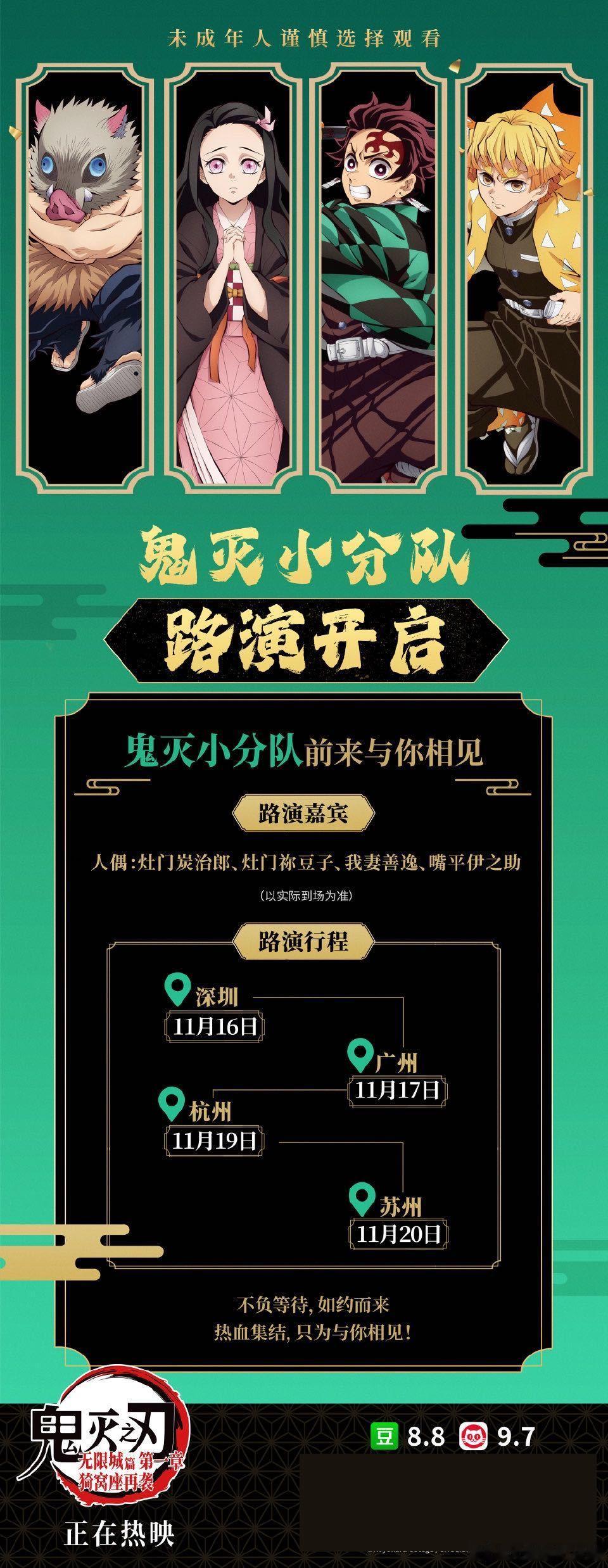 《鬼灭之刃:无限城篇》今天上映的热度直接登顶🔥成为中国影史日本进口片首日票房冠军。在北京特邀观影会还见到了炭治郎、祢豆子、善逸和伊之助的人偶,四小只营业的样子萌得人心都化了不在北京的朋友也不要遗憾,城市路演四小只还会去到深圳、广州、杭州、苏州和大家见面,听说每站路演都会人手发放海报、票根、贴纸特典,主打一个不让人空着手走,想要特典想和人偶互动的朋友们可以放心冲一波!🏃🏃🏃
