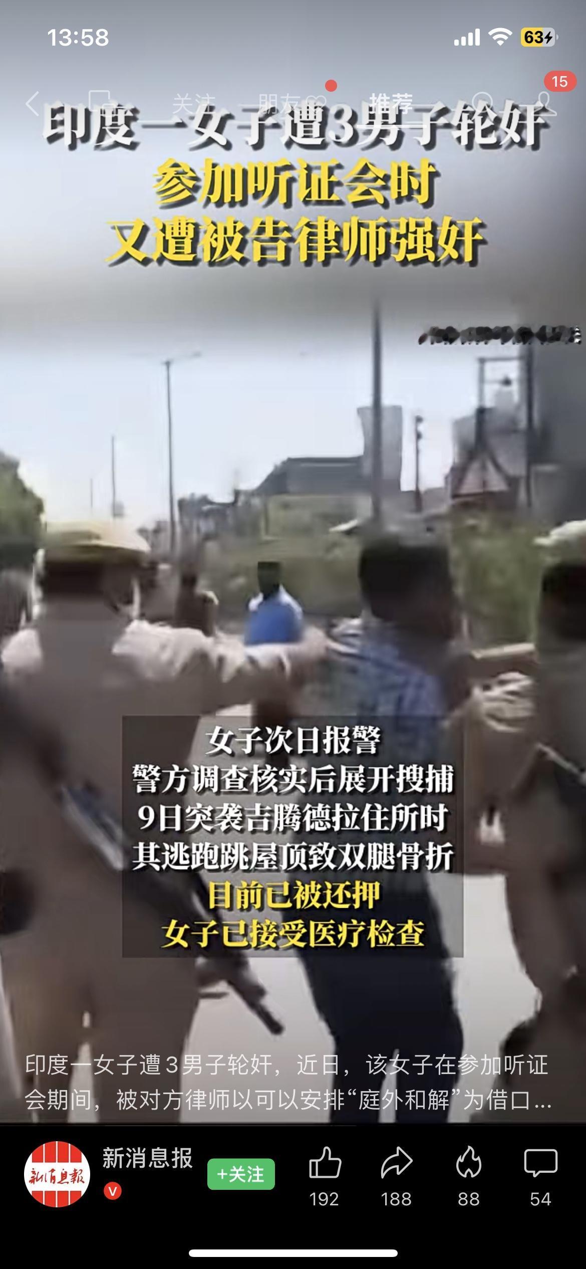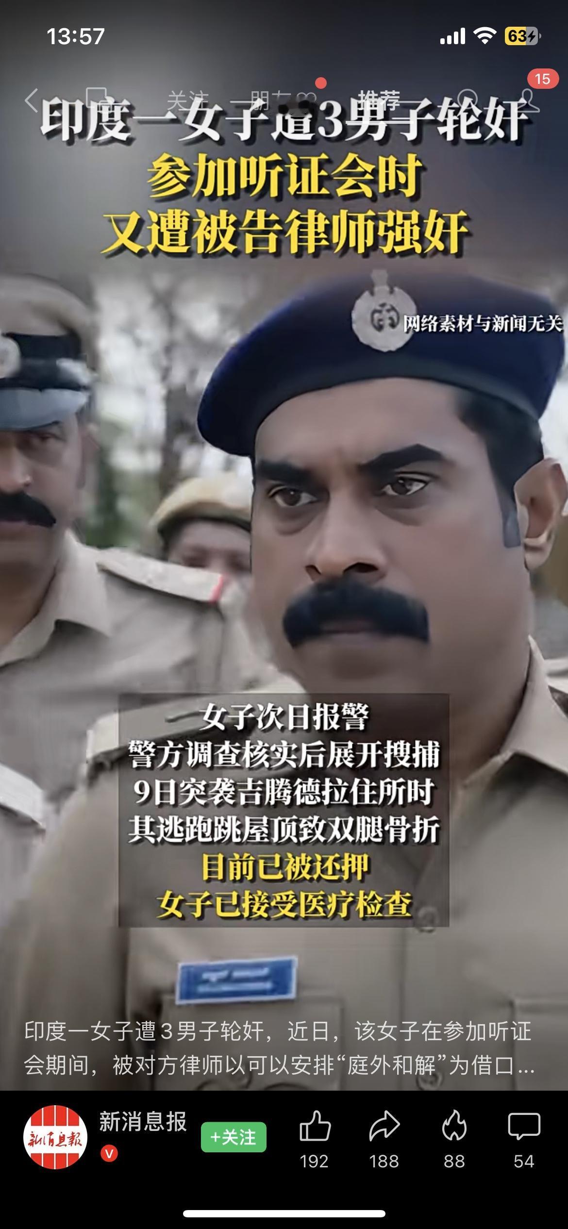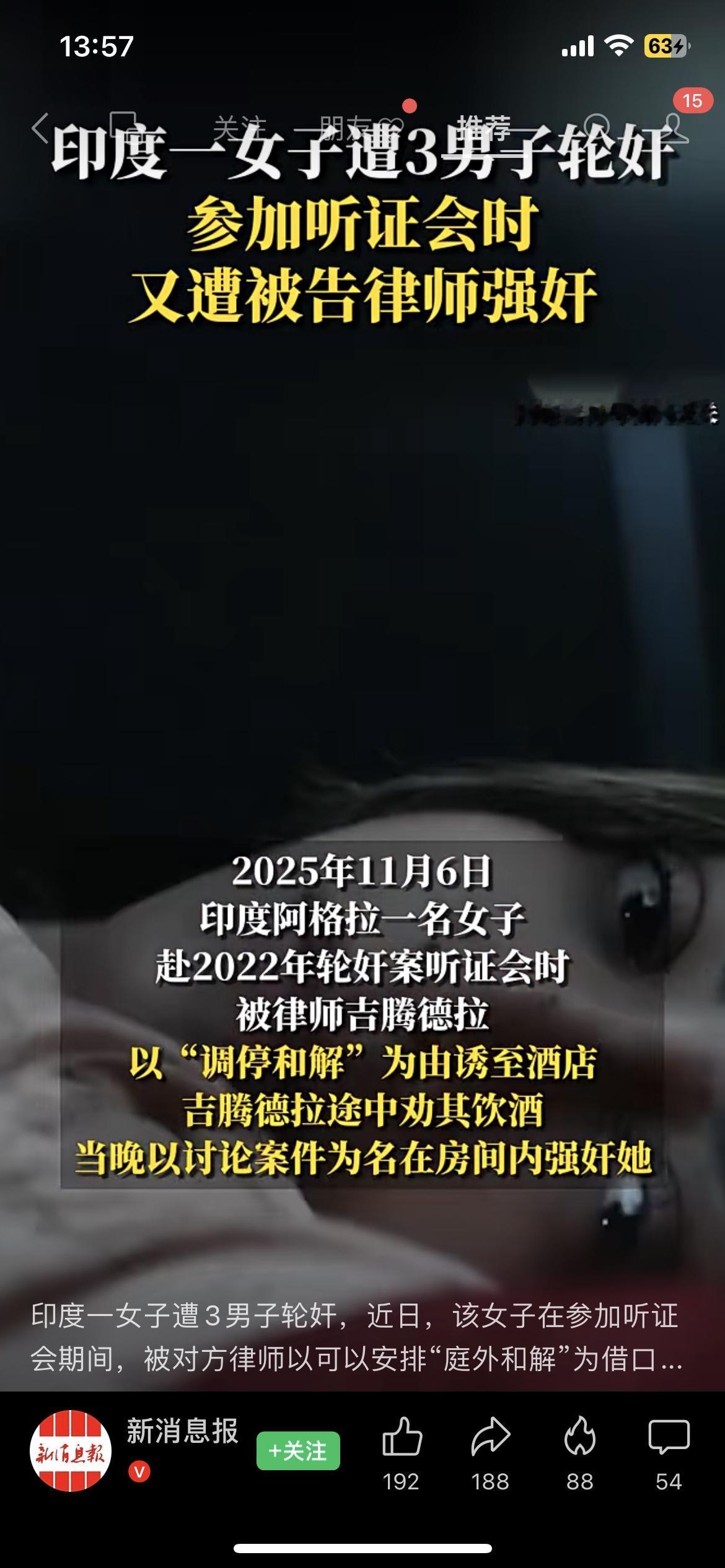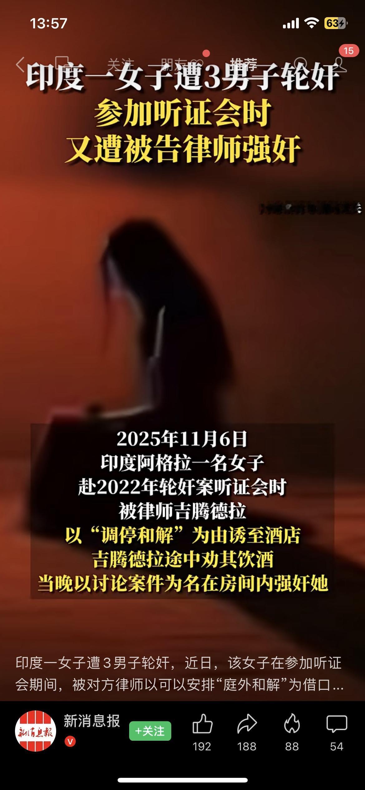 气得发抖!印度女子遭轮奸后,竟被被告律师二次性侵! 印度近期发生的这起事件太让人愤怒了!一名24岁女子先遭3人轮奸,好不容易鼓起勇气参加听证会,却被被告方律师以“调解”为借口骗到酒店性侵。更可气的是,施暴律师被抓捕时还想跳楼逃跑,结果摔断了腿!本该维护正义的律师沦为施暴者,印度女性安全问题真的太揪心了,必须严惩这种败类!强奸 性侵案
