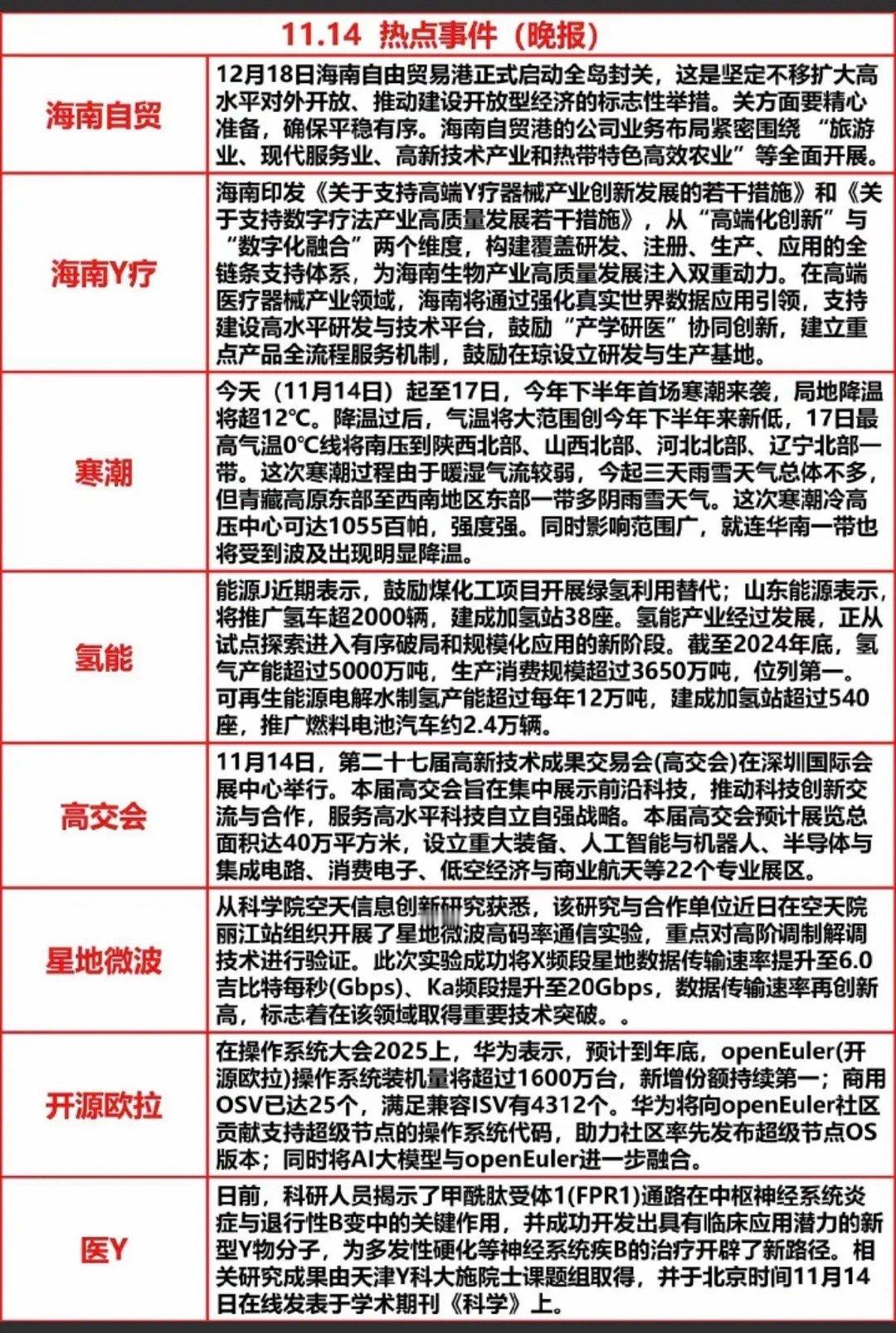 11.14周五 晚间 财经热点汇总!1.海南自贸港2.海南医疗,医药3.寒潮4.氢能5.星地微波6.开源欧拉、
