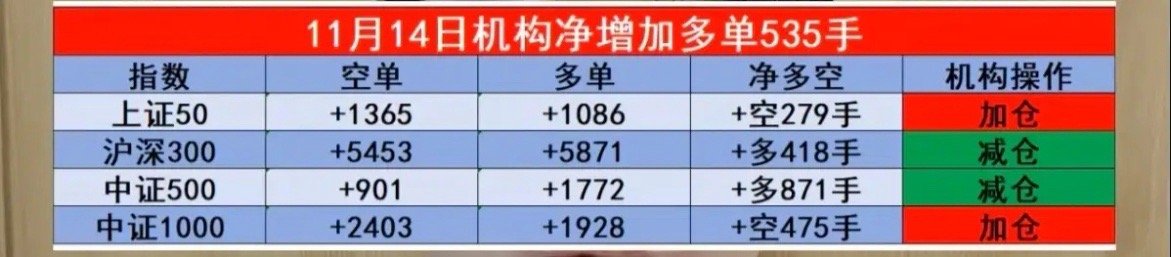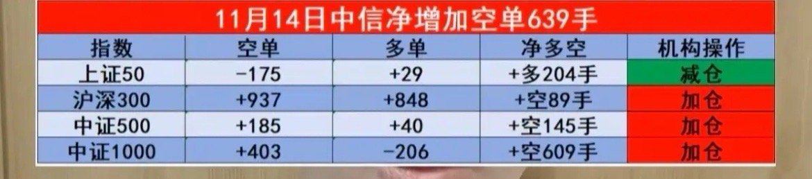 11.14周五晚间 利好!中信逆势加仓了!最新期指数据来了!中信净增加空单639手机构净增加多单535手从期指数据看:虽然大盘下跌,大家个机构都有恐慌趋势,但今天中信却逆势加仓了!不作为投资买卖建议,仅供参考、