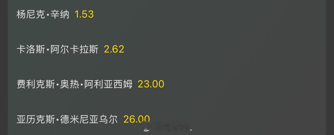 总决赛四强夺冠赔率辛纳:1.53阿尔卡拉斯:2.62阿利亚西姆:23德米纳尔:26