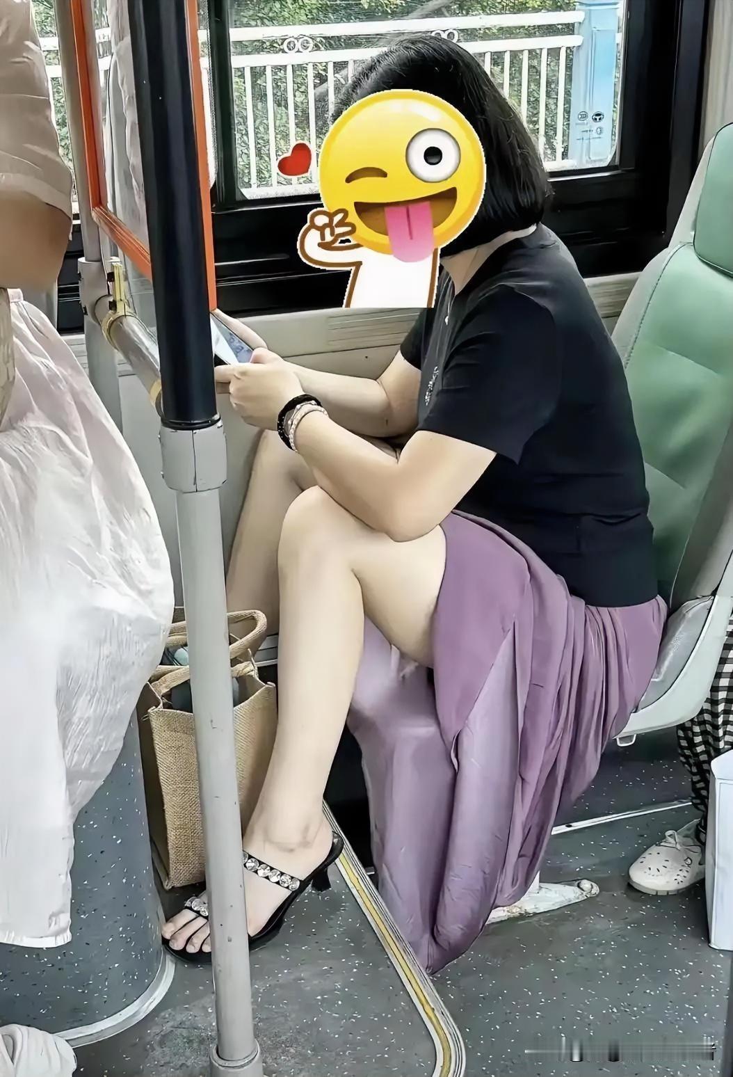 这位女士,上身穿着黑 t 恤,下身穿着粉色长裙,乍一看,在公交车上坐的也没什么。 可是走到她的侧面,感觉好像这个姿势太豪放了,虽然你是单独一个人的侧边座位,可是毕竟前后左右都是人,尤其公交上还可能有孩子,大家说,她这样坐着真的雅观吗