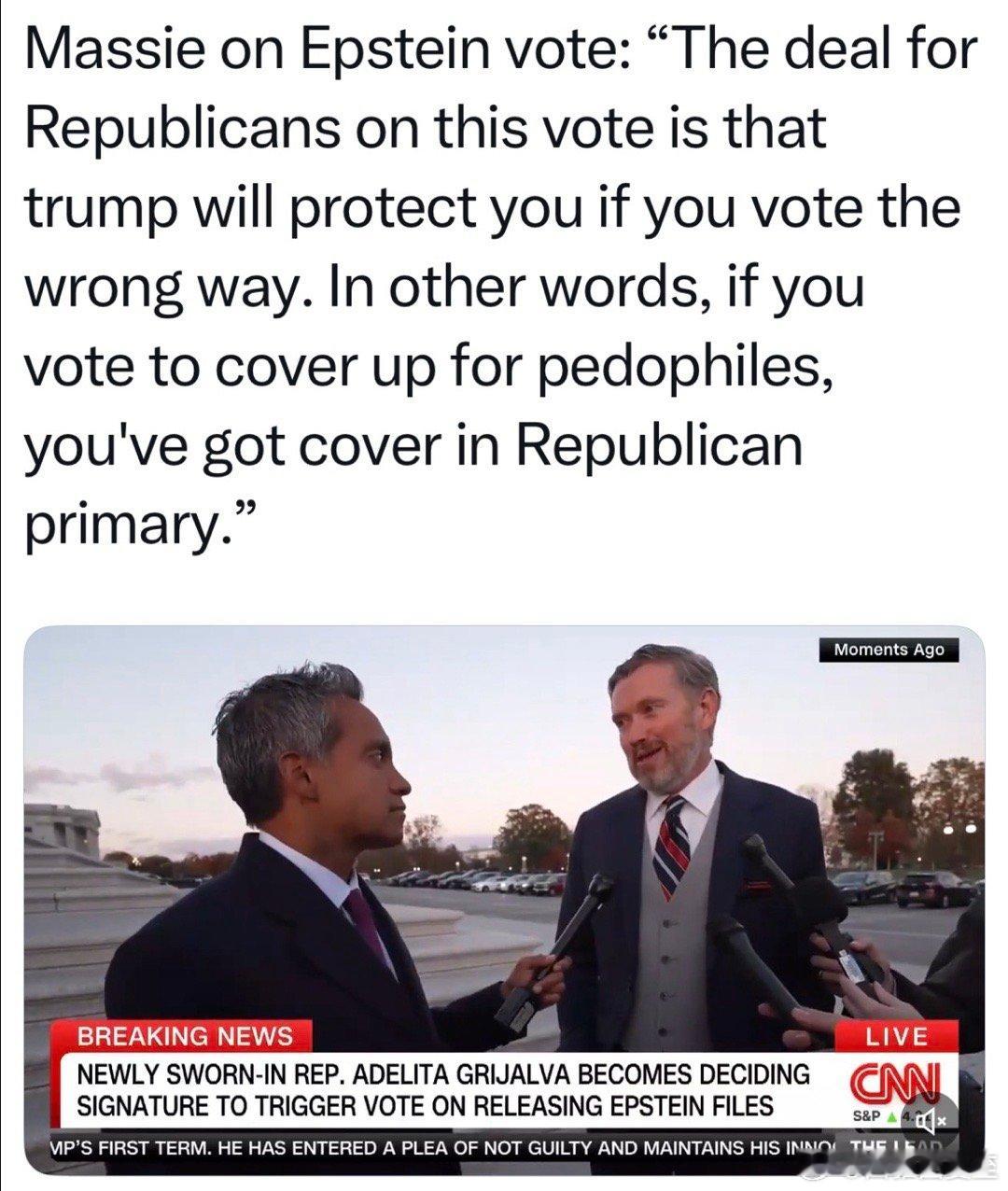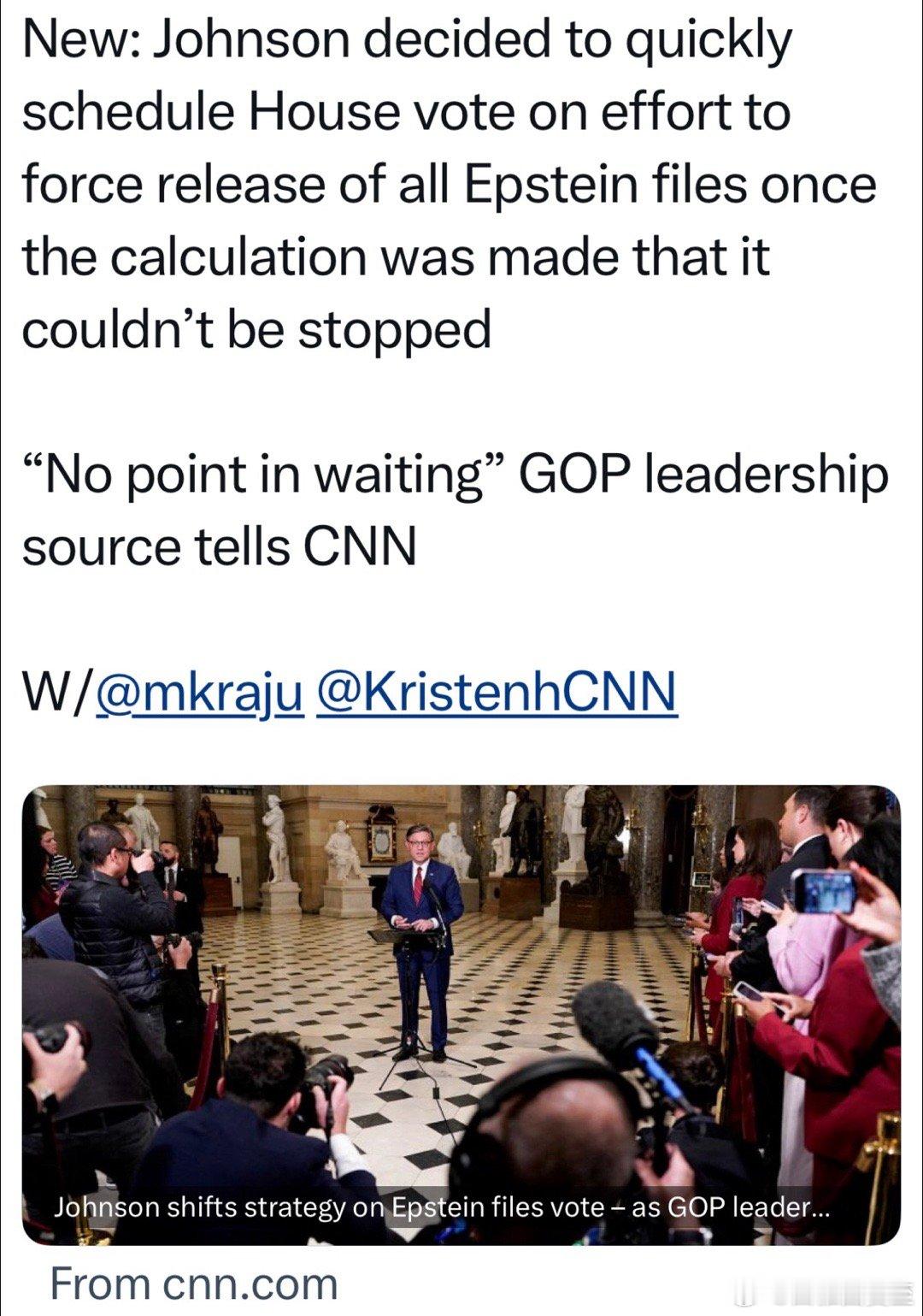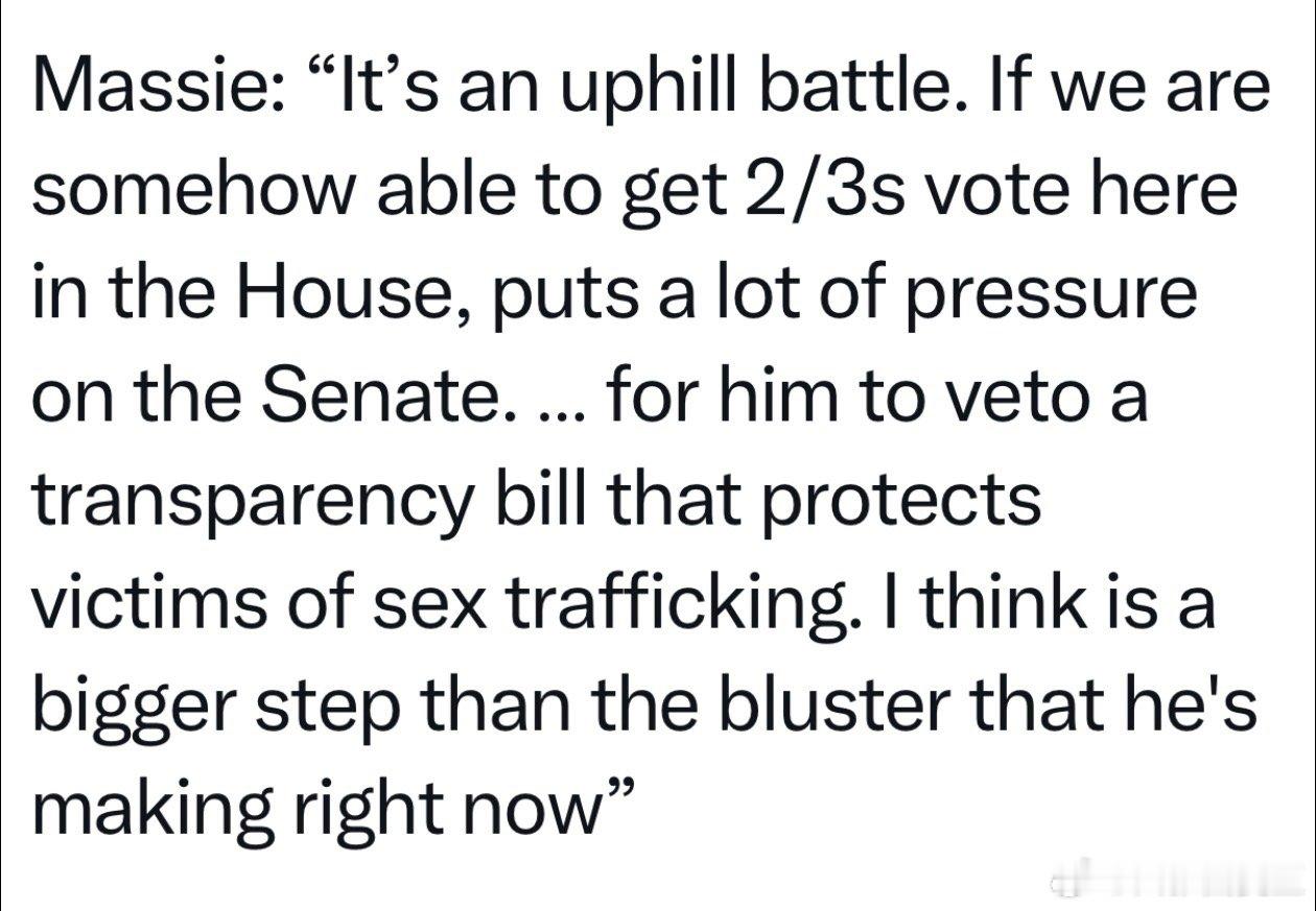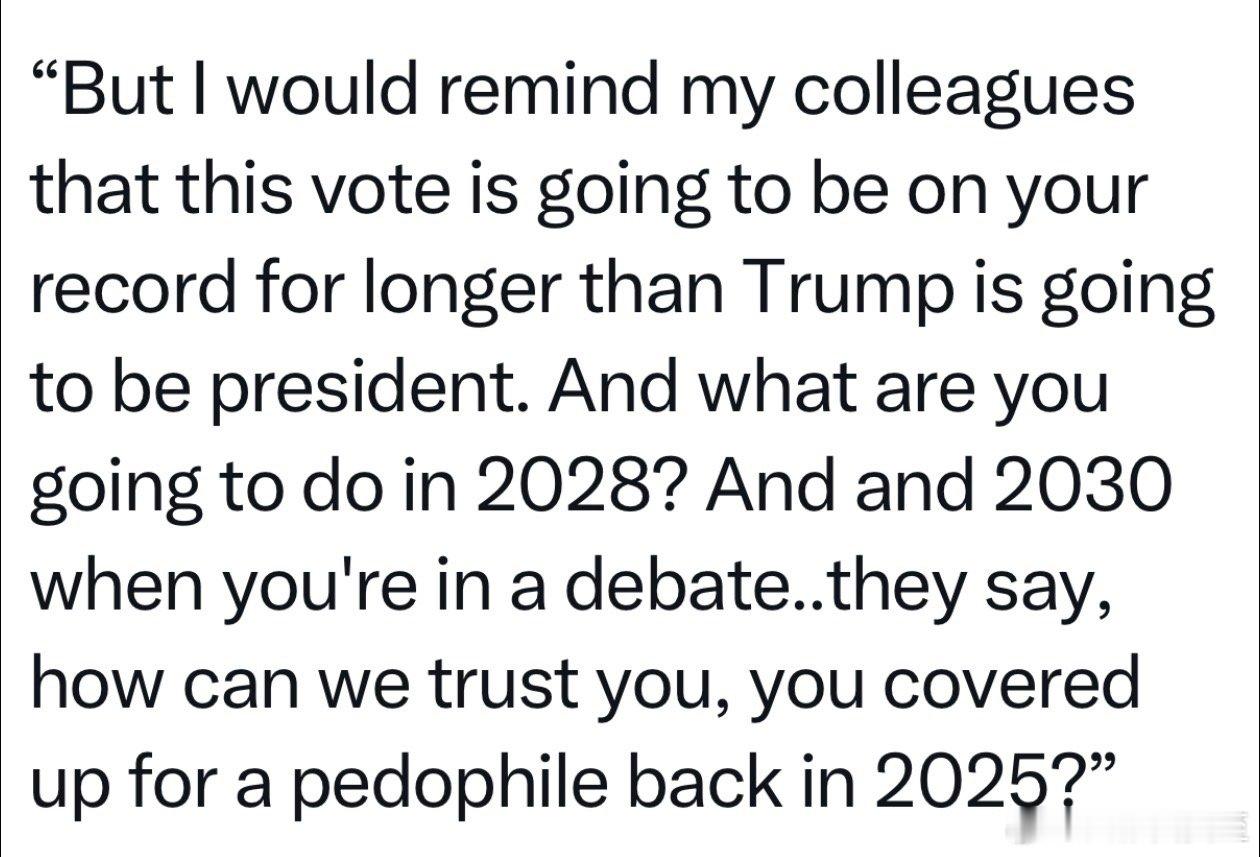 众议长决定:迅速进行“公布Epstein档案”投票,因为阻挠已经失败、再拖没有意义初步定于下周二,众院全体表决肯定能过,关键是争取2/3多数,可抵抗总统否决权发起人称:总统向共和党议员承诺,如果现在保他,党内初选时他会支持…但投票纪录存在的时间,比T当总统的时间长,反对 性 侵 未成年人的票,如果投No,以后向选民不好交代争取2/3绝对多数,任重道远