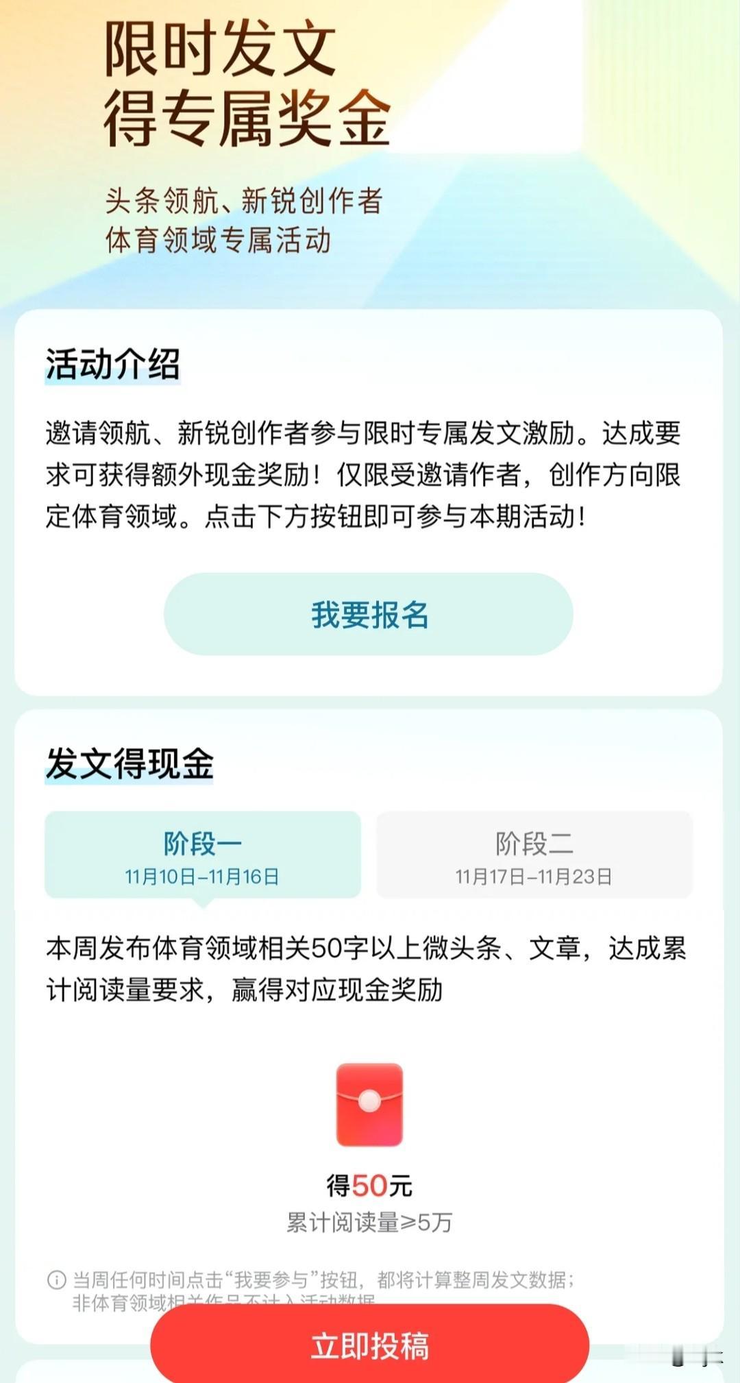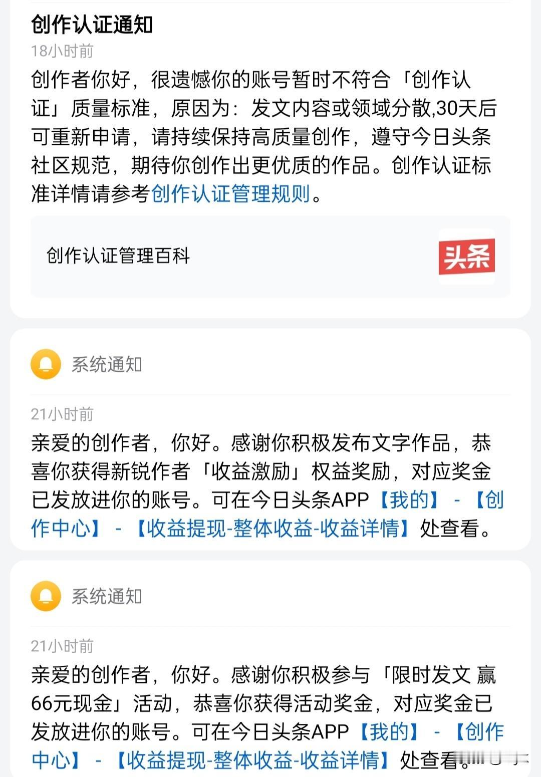 昨天的心情是一半高兴一半糟心。刚到手头条限时发文的66块+新锐创作者的5块,71块热乎收益没捂热,下午就收到通知:新锐创作者身份被取消,创作认证没通过,这周的体育限时发文活动估计也黄了,可要求的5万阅读量我已经达到了。 说真的挺无语,我早定了方向,就是喜欢看球赛、写体育内容,顶多偶尔加些生活碎片,没想到就被判定“没定准方向”。本来还想借着活动多更点体育相关,这下连活动都可能泡汤,确实扫兴。 不过也没纠结,本来就是写自己喜欢的东西。没活动时每天三五块够买瓶汽水,现在没了额外奖励,大不了回归纯记录。写想写的球赛感悟,记点生活小片段,图个自在就好。 等30天认证期到,把体育领域内容再聚焦些,跟着创作训练营学方法,慢慢攒内容就行。当下接着写,开心最重要。