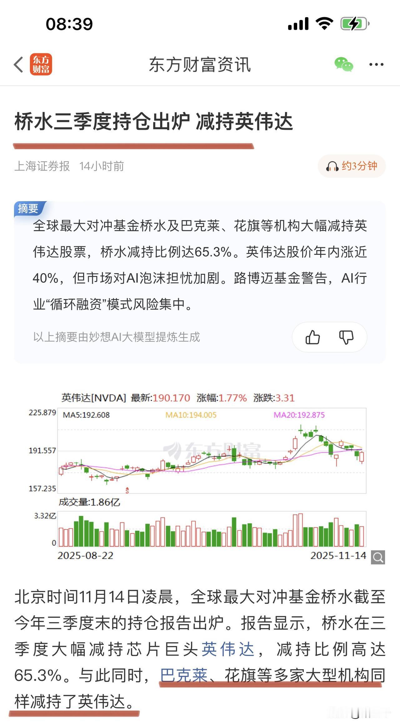 隔夜英伟达顶住了财报季减持利空! 低开高走打下第二根桩, 4.5万亿市值面对几百亿减持似乎毛毛雨, 杀伤力大的是单日跌5%大阴线! 软银清仓转身买OPenAi; 桥水减持65.3%没什么代表性, 它相当于一个顶级牛散, 抓题材、抓热点还会创造热点。 Ai科技最危险的时刻还没有来到, 预计最快明年二季度之后, 到时候预期若是无法兑现, 美股大型科技回调40%属于正常。 至于A股2-3折大家习以为常, 1折以下也见怪不怪, 老股民抗击打能力强!