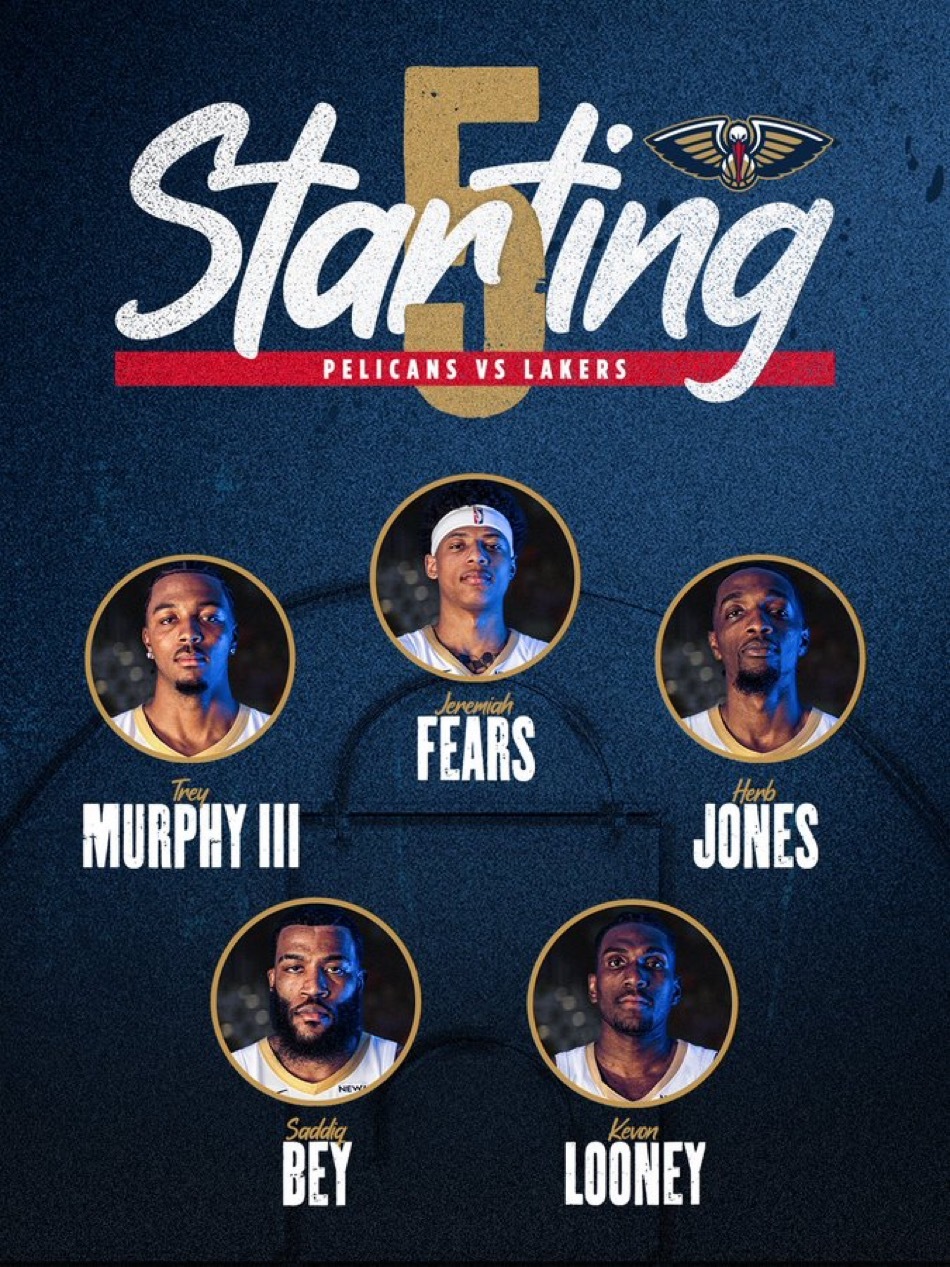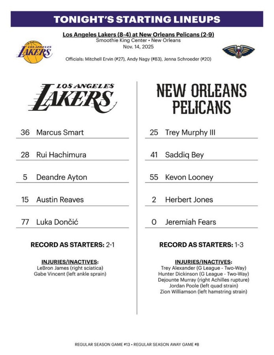 湖人vs鹈鹕首发湖人首发名单:东契奇、里夫斯、斯玛特、八村塁、艾顿鹈鹕首发名单:费尔斯、琼斯、墨菲、萨迪克-贝、凯文-鲁尼 📺: