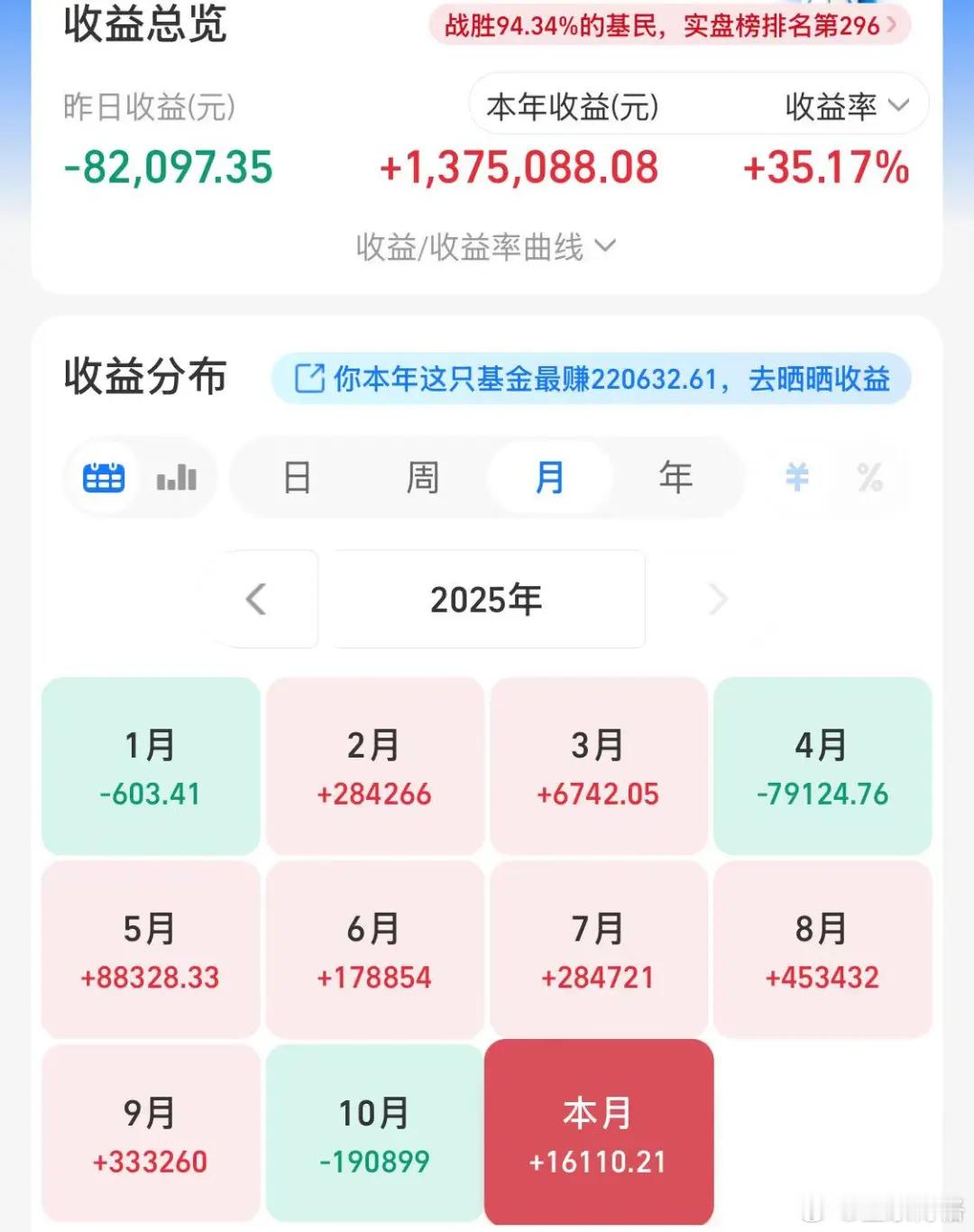 博格目前主要有三个账户:场内ETF账户资产240万元;场外基金账户资产560万元;投顾组合持仓资产110万元,合计持仓近1000万元了。10月份巨亏之后,11月份也不好受,博格回顾一下账户盈亏情况:ETF账户今年盈利50.5万,收益率为42.56%。这些收益主要来源9月份之前港股的大涨,最近加仓了价值ETF平滑了一下收益。今年以来11个月里面,唯有1月份与10月份亏钱,其余月份都是盈利的,这个也验证了适当做一些轮动可以平滑收益的。场外基金账户今年盈利137.5万,收益率为35.17%。大部分都是长期持仓,最近也止盈了人工智能、机床与化工,目前持仓盈利最多就是资源类基金,收益率大概在80%左右。今年以来11个月里面,唯有1月份、4月份、10月份三个月是亏钱的,其余月份都是赚钱的,对于一个500万资产的大账户收益率超过35%,博格还是可以接受的。市场在4000点左右盘整了差不多两三个月了,本来已经站上4000点了,昨天回调再次跌破4000点,说明4000点真的不容易突破,原因如下:4月第一次关税事件,投资者都是比较悲观的,之后国家入场加仓队之后,投资者转向乐观,先是创新药大涨,接着是国产算力大涨。9月第二次关税事件,投资者突然觉得关税这事未来可能会反反复复,情绪开始由乐观转为中性,对于涨幅过高的行业,不少投资者开始选择止盈了。结果便是,今年以来:一直持有科技成长的赚钱了;一直持有价值红利的也赚钱了;半途从价值红利切换到科技成长大概率亏钱了。大盘都4000点, 根据某些机构的数据,今年依然有50%的投资者是亏损的。根据博格的经验,亏钱的大多是小户,因为大户资产多基本都是采用配置策略,而不是频繁交易的轮动策略,亏钱的概率非常低。