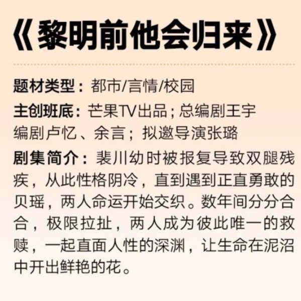 《黎明前他会归来》阵容🈶毕雯珺、张淼怡、翟潇闻、鹤男、丁笑滢,暂定12月开机