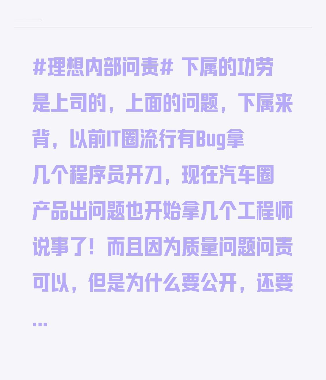 问责只拍“苍蝇”,何以震慑“老虎”? 理想的“内部问责”,正演变为一场失衡的“甩锅”游戏。产品一旦出现问题,冲锋在前的研发工程师便首当其冲,成为被严肃处理的“典型”;而本应承担首要责任的项目或产品负责人,却往往在“批评”、“反思”等轻描淡写的处理中安全落地。这俨然成了职场潜规则的现实写照:下属的功劳归于上司,上司的问题则由下属承担。 更令人费解的是,这种问责为何要高调公开,甚至任其流转至媒体,成为一场对基层员工的公开处刑?这非但不能解决问题,反而制造了寒蝉效应,让真正做事的人战战兢兢。 在强调“项目中心制”的今天,Mega项目或产品的第一负责人,理应是质量问题的“第一责任人”,研发体系的管理者次之。如今却本末倒置,只拿几个“小喽啰”开刀。这种“罚下不罚上”的机制,如何能触及问题的根本?它维护的究竟是产品的品质,还是某些人的“面子”与权位? 这种选择性的问责文化,若不改变,最终侵蚀的将是整个组织的公信力与创新的勇气。