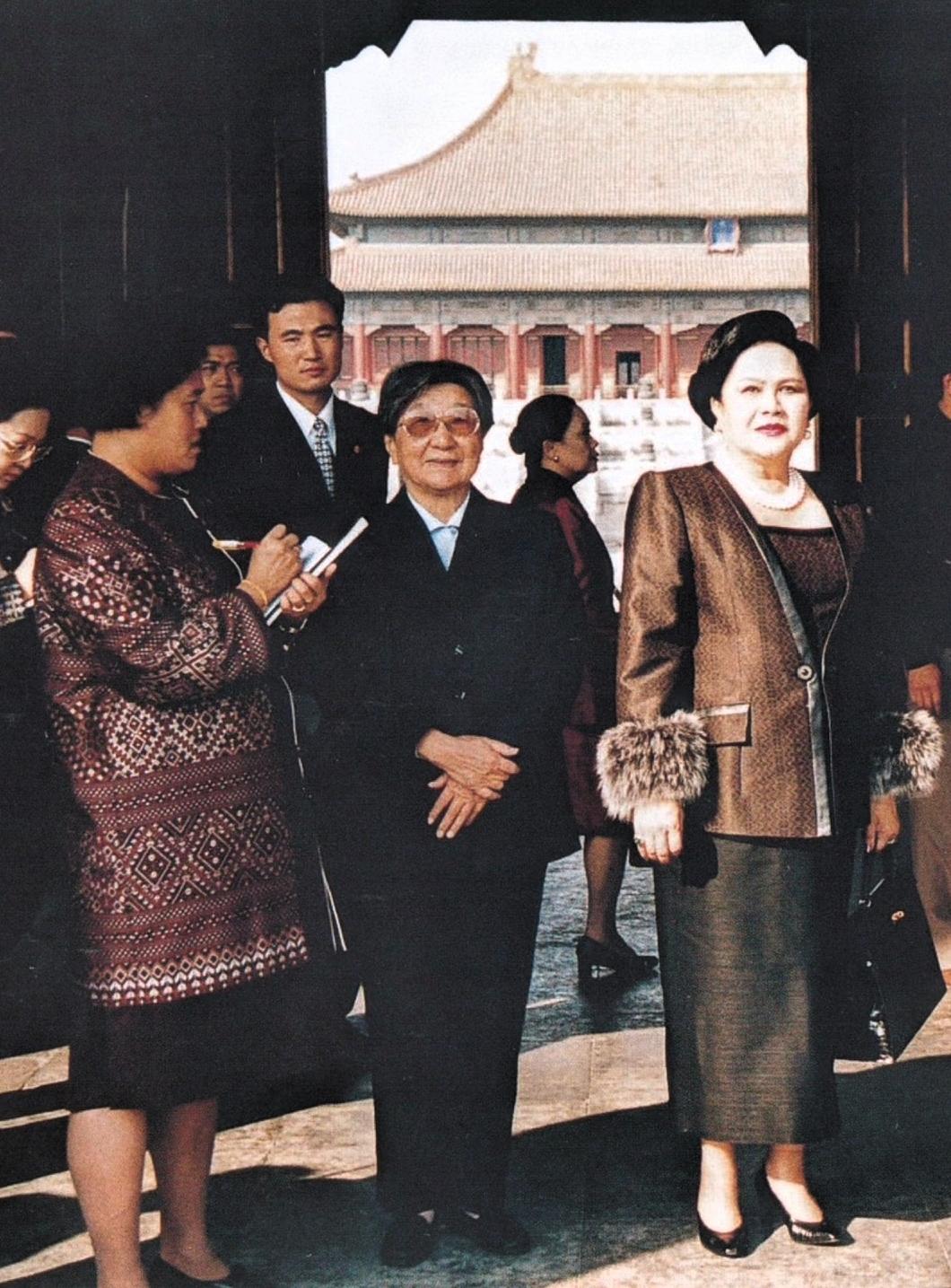 25年前的秋天,诗丽吉王后访华期间与女儿诗琳通公主和钱正英钱院士在故宫前拍照留念。 诗丽吉雍容华贵,诗琳通平易近人,我们的钱院士虽然衣着朴素,却气质卓越。 三位都是非常优秀的女性,她们互相挽着,留下这张珍贵的合影。 钱院士生于江南名门望族嘉兴钱氏,与钱学森、钱伟长、钱三强、钱穆等大拿都来自同一家族。 钱正英15岁考入上海大同大学土木工程系,是中国水利事业奠基人之一,著名的水利专家,1997年当选工程院院士。 钱院士与诗丽吉还都是高寿,诗丽吉享年93岁,钱正英享年99岁。