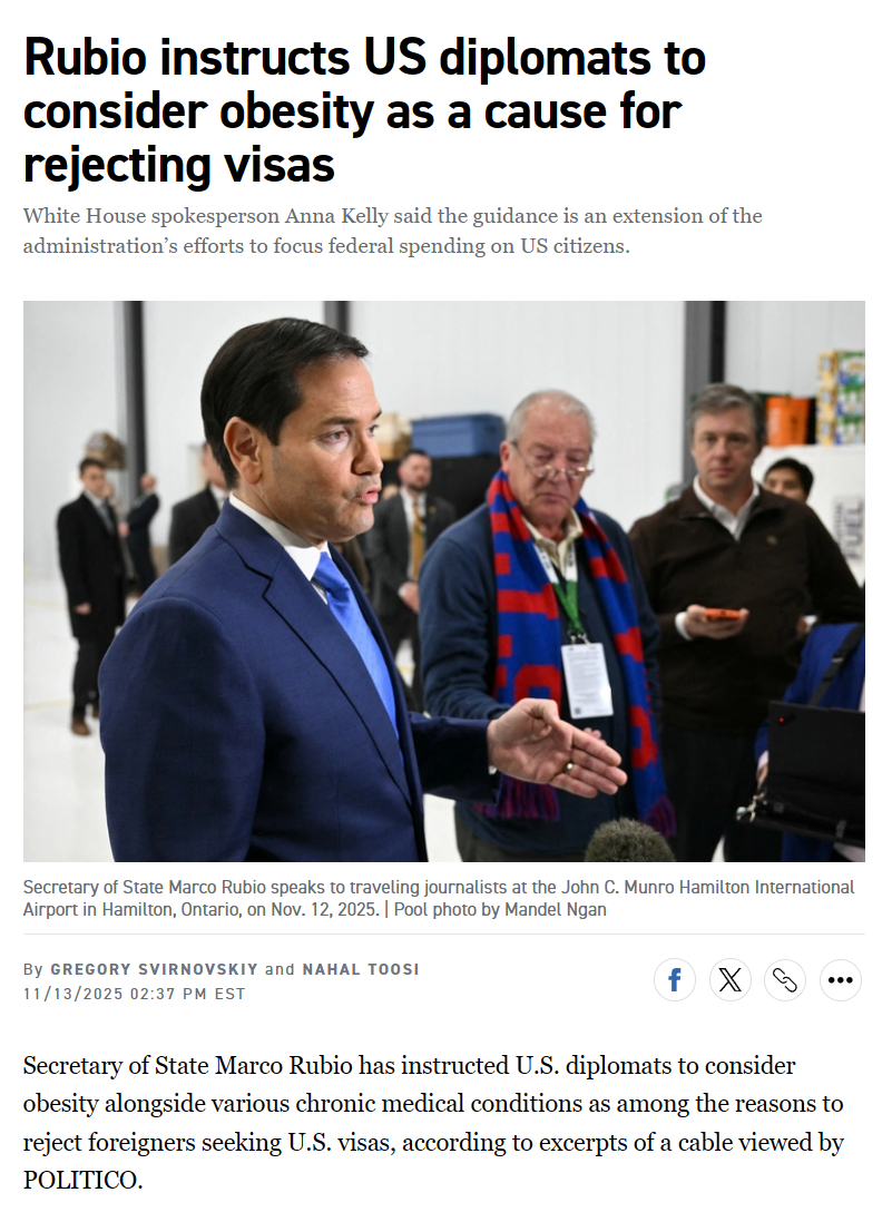 鲁彪已指示美国签证官:拒签外国胖子。因为外国胖子一旦在美国病了,可能会花美国的钱。美国的钱要留着给美国人花。嗯,不过美国胖子更多吧。肥胖率多少来着?