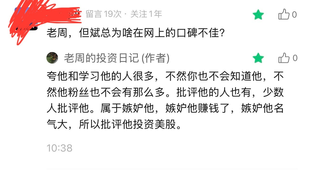网友问我:老周,但斌总为啥在网上的口碑不佳?我回答他:夸他和学习他的人很多,不然你也不会知道他,不然他粉丝也不会有那么多。批评他的人也有,少数人批评他。属于嫉妒他,嫉妒他赚钱了,嫉妒他名气大,所以批评他投资美股。老周再补充下:但斌总写的时间的玫瑰,出版十几年了,一直是畅销书,很多炒股的人都买了或者看了他的书。这就是认同他的实力,学习他。他传播价值投资,分享他的投资观点,帮助了很多人,很多人受益了。老周曾经看他的书、访谈、博客、微博受益了,所以我一直感谢他,在网上挺他。另外但斌总赚钱不忘慈善,这些年累计捐款过亿了,做了很多好事。至于缺点,谁没有缺点呢。批评他的人没有缺点?批评他的人就完美?学习别人的优点,改掉自己的缺点。而不是盯别人缺点,批评别人。要严己宽人。