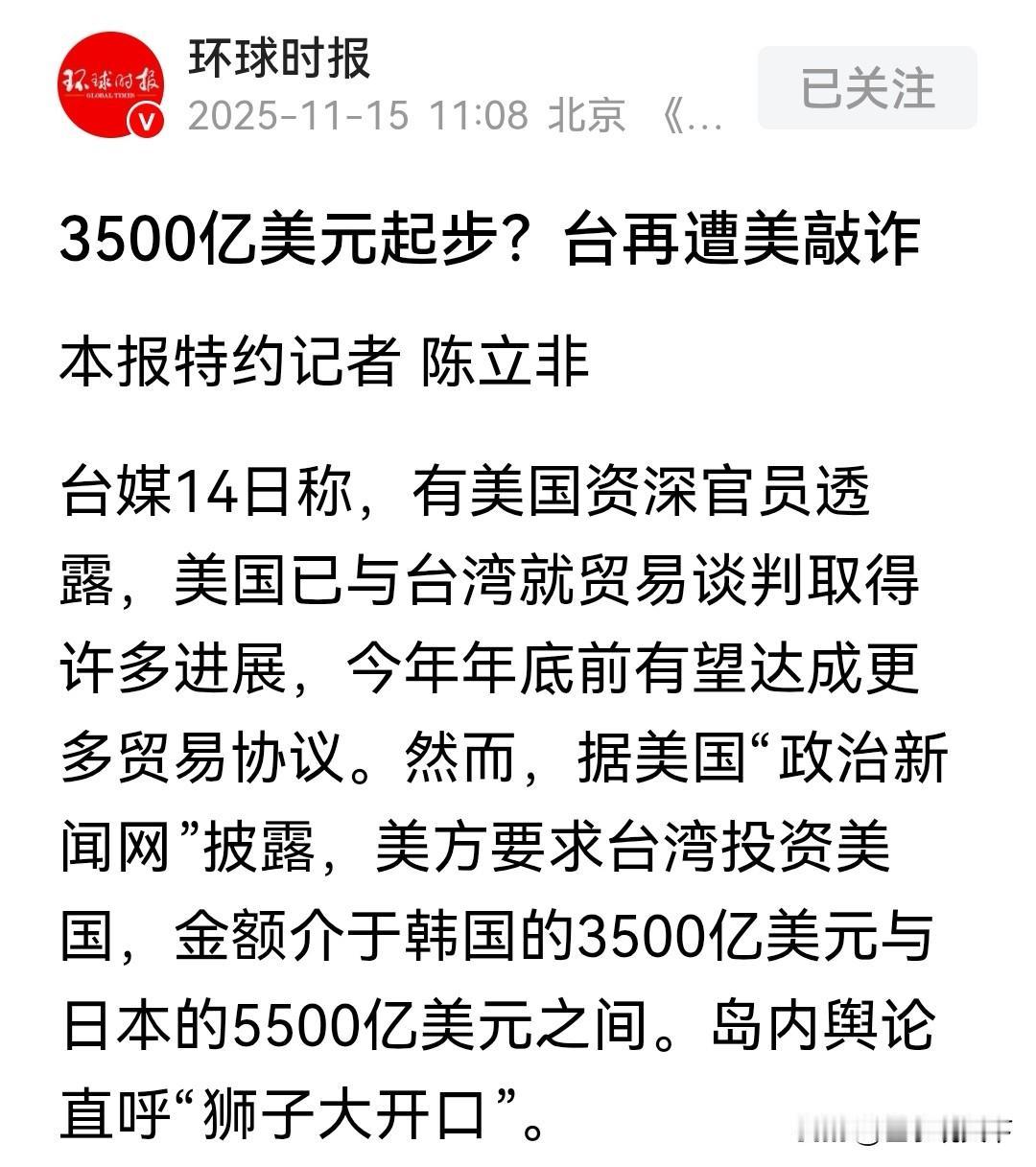 美国真是把台湾当冤大头了! 直接开口要3500亿到5500亿美元的对美投资, 卡在日韩之间, 这不就是明抢吗? 要知道台湾经济规模远不如日韩,这数字快赶上半个GDP了, 相当于掏空几代人的积蓄! 岛内舆论直接炸锅喊“狮子大开口”, 民进党当局还不敢说不, 纯属拿民众血汗钱讨好美国, 这波“卖台”操作谁看了不气! 美国对台湾态度