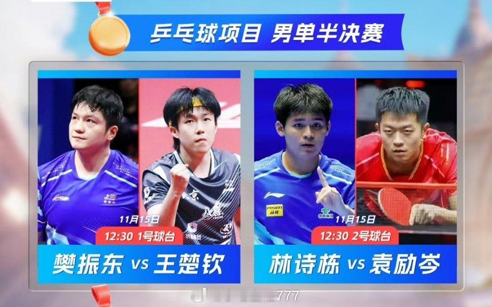 第十五届全运会乒乓球男单半决赛11月15日12:30,1号台,樊振东vs王楚钦11月15日12:30,2号台,林诗栋vs袁励岑具体以直播时间为准,期待精彩对决!