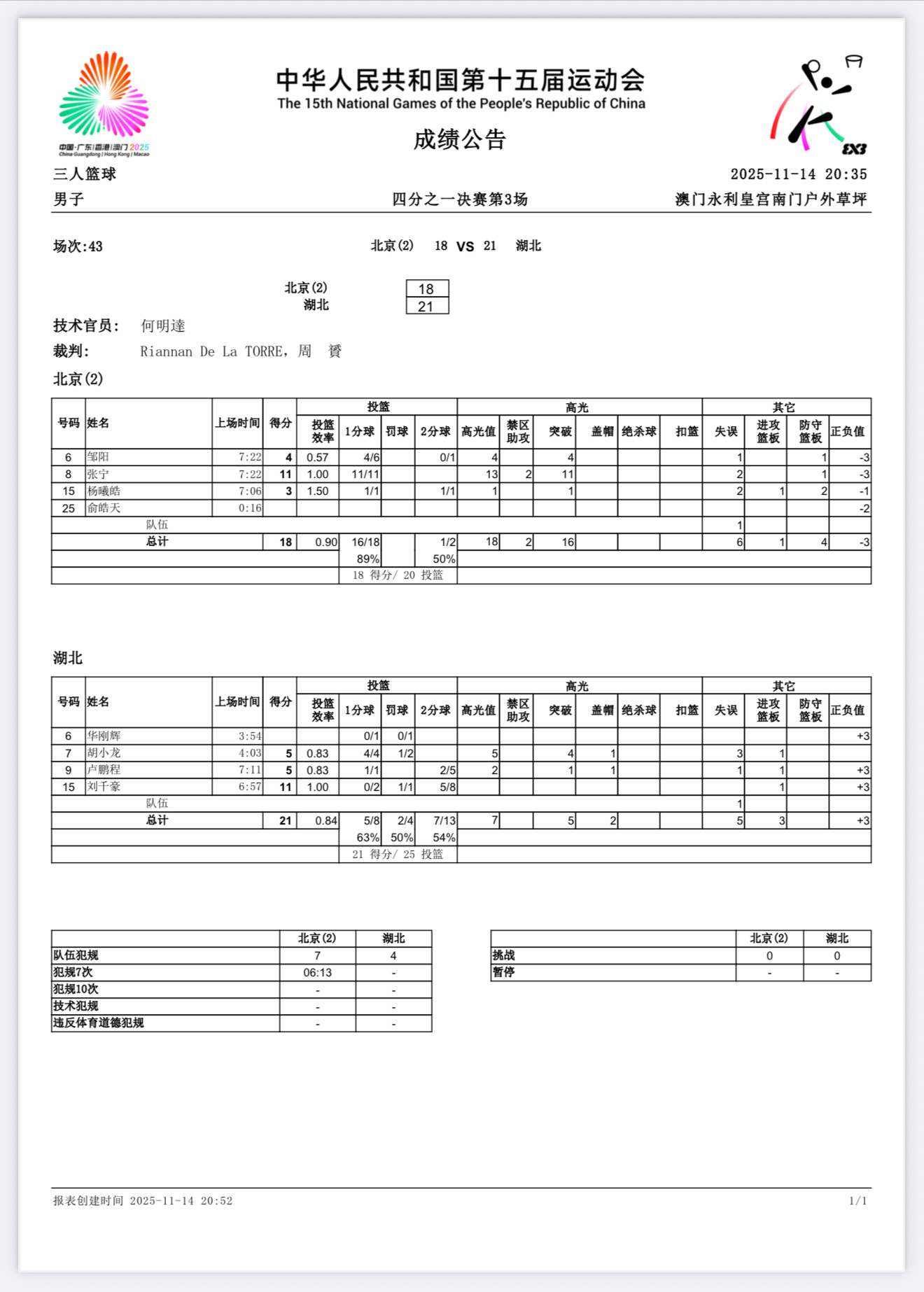 三篮大冷门?拥有张宁、邹阳、杨曦皓的北京队不敌湖北无缘四强。湖北队手感爆炸,全场