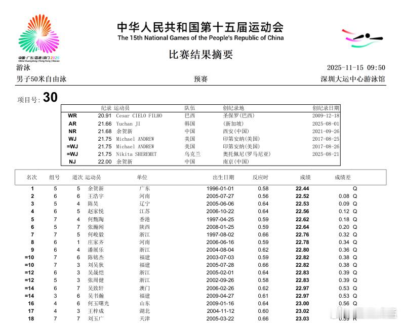 广东老将全运男50自预赛头名志在连冠 潘展乐调整蓄力隐藏真功夫11月15日上午,全运会游泳大项结束男子50米自由泳预赛,上届全运该项目冠军、29岁的广东队老将余贺新,以22秒44的成绩排名预赛第一位。余贺新在第五组就已出场,同组辽宁选手陈昊,在今年全国冠军赛上0.01秒优势险胜余贺新获得季军。此番交手,余贺新抢占先机,22秒44获小组第一,陈昊22秒53小组第二。全冠赛冠军潘展乐,第六小组出场。潘展乐这场放得有些狠,只以22秒80拿到小组第四,河南选手王浩宇22秒52小组第一。今年世锦赛杀入半决赛的香港选手何甄陶,第七小组对决全冠赛亚军、浙江选手何峻毅,两何之争,何甄陶以22秒62列小组第一,何峻毅22秒76第二。预赛总排名余贺新第一,王浩宇第二,陈昊第三。何甄陶第五,潘展乐第九。该项目半决赛将在今晚19点32分和19点37分进行。