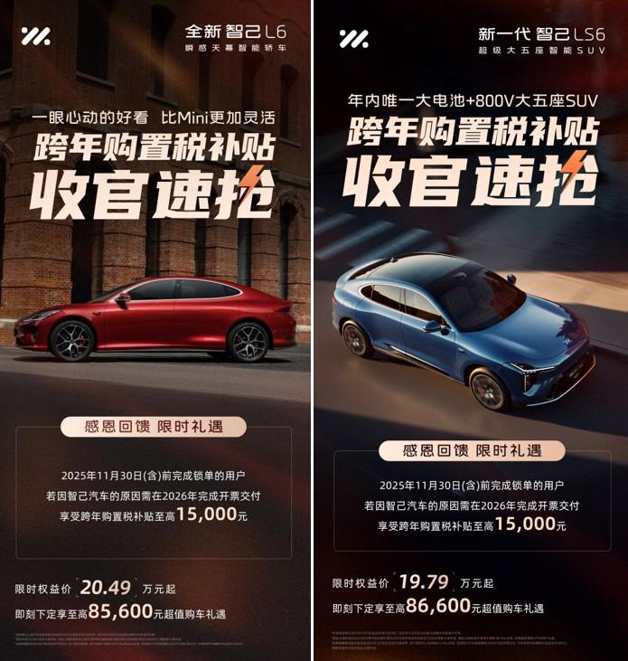具体来看,全新智己L6限时权益价20.49万起,新一代智己LS6限时权益价19.79万起。用户在2025年11月30日(含)前完成锁单,如果因为智己的原因在2026年开票交付,智己提供兜底,可享受至高15000元的跨年购置税补贴,并且此次政策覆盖智己LS6 Ultra车型,精准对冲政策调整成本。而相较于智己此前双十一补贴仅限11月11日前锁单、且智己LS6 Ultra车型无缘购置税兜底的限制,此次升级不仅延长了锁单周期,更实现了全车型、全版本覆盖。 优惠力度够劲,产品实力更是同级标杆。全新智己L6入门即顶配,全系标配同级唯一的灵蜥数字底盘2.0,搭配同级独有的智慧四轮转向系统和线控制动系统,四驱版车型可实现4.39m极小转弯半径,灵活性比肩MINI。新一代智己LS6则精准攻克续航与补能痛点,搭载行业领先的恒星超级增程系统,可实现450km同级最长纯电续航,远超理想L6、问界M7等同级车型。1500km综合续航彻底告别里程焦虑,日常通勤可实现“一周一充”,长途自驾无需频繁补能。 对于消费者而言,此刻购车正赶上“政策红利+品牌补贴”的双重福利。如果不能锁定最后一波全额购置税免征政策,还有智己的跨年购置税补贴保障。不过需要注意的是,此次优惠政策截至2025年11月30日,心动的朋友要抓紧锁单。