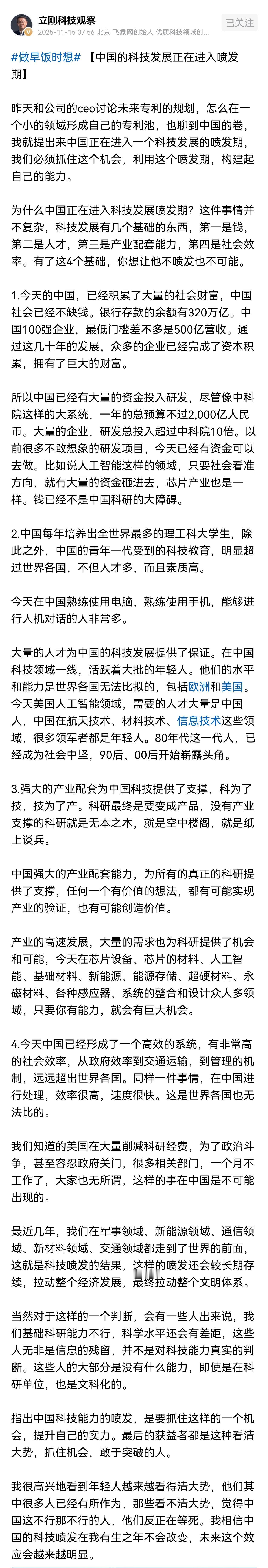 项立刚:看清大势,中国科技进入井喷期 最近这几年,我们在新能源、人工智能、六代机等方面发展迅速,项立刚作为信息产业的专家,对科技有着自己深刻的观察,他认为中国的科技正在进入井喷期。之所以有此判断,主要基于四点考虑:一个是资金,二是人才,三是产业配套,四是社会生产效率。 首先资金,如今中国的社会已经积累了大量的财富,尤其是大量的企业。以华为、阿里等企业为代表的头部企业,每年在科研上的投入都是巨额的,也正是如此我们在通信、特高压、人工智能等方面发展迅速。 其次是人才,可以说这几十年我们的教育培养了大量的理工科的人才,尤其是这两年80后、90后,甚至是00后开始挑大梁,虽说现在大学生就业困难,但带来的现实是社会有着大量的人才储备。 再者就是配套产业,如今我们有全世界最齐全的制造业体系。项立刚说科为了技,技为了产,科学最大的问题和难题就是转化,空洞的理论落不了地,就是虚妄的。而在这一方面,我们全世界的前列,我们的配套产业为所有真正的科研提供了支撑。 最后就是管理效率。不管是物流运输,还是政府管理,我们的效率都是最高的,我们的社会动员能力也是领先全球的。管理的效率高,管理损耗就低,科技发展的速度就会快。 这些因素共同促进了当前我们当前的科技井喷式的发展,有人敏锐的发现了,抓住了机会,提升了自己的实力,尝到了甜头。而有些人还停留在过去,认为我们就是比不过别人,他们当然就抓不住机会,现实也会结结实实给他个大耳光。