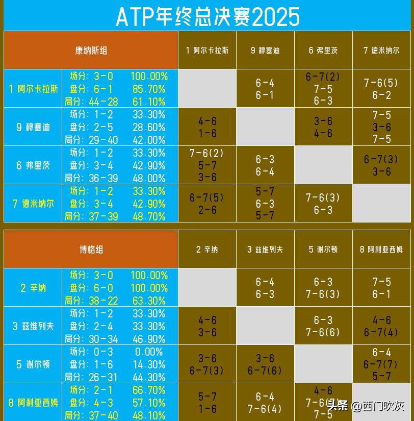 【ATP年终总决赛2025小组赛战报!阿尔卡辛纳携手德米纳尔阿利亚西姆晋级四强!】 恰好都是中间的两位种子出局,如果德约科维奇参赛,结果会不同!到也就仅限于小组赛。