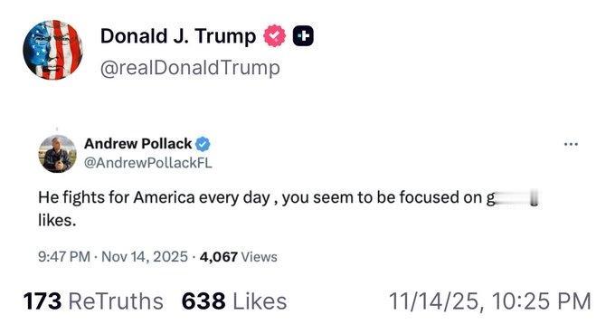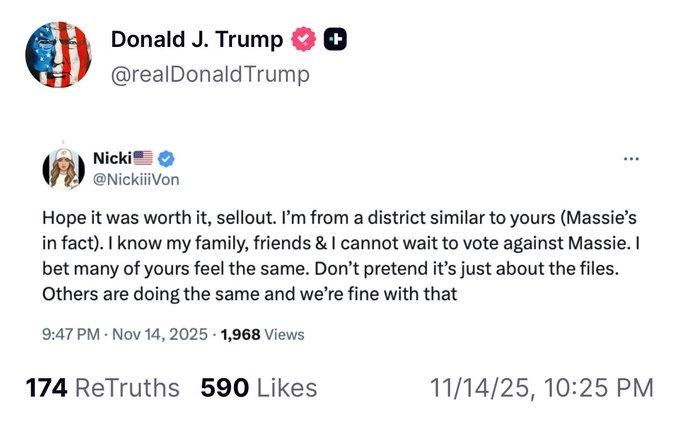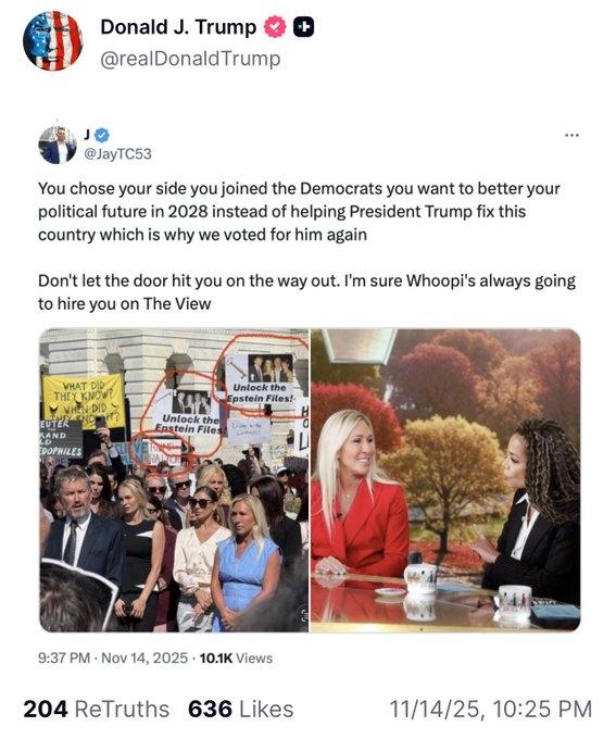 由于玛乔丽.泰勒.格林极力主张公布爱泼斯坦的档案文件,川普与她,这对曾经的盟友,友谊小船说翻就翻 特朗普现在正在转发一些随机账号发布的攻击玛乔丽·泰勒·格林的帖子。