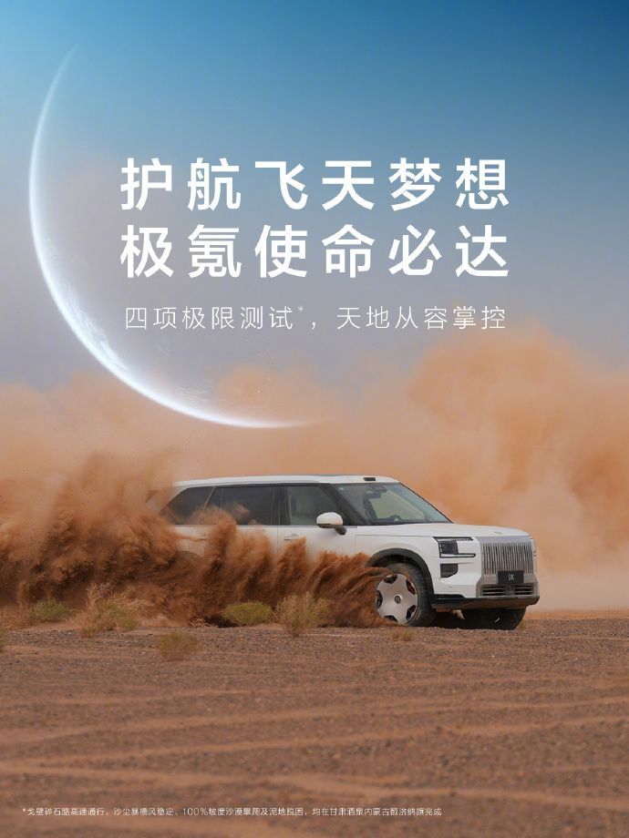 中国汽车品牌极氪的旗舰SUV车型极氪9X将参与到航天任务中,并通过戈壁滩通行稳定性测试、沙尘暴环境等测试。探索浩瀚宇宙,发展航天事业,建设航天强国,是我们不懈追求的航天梦。
