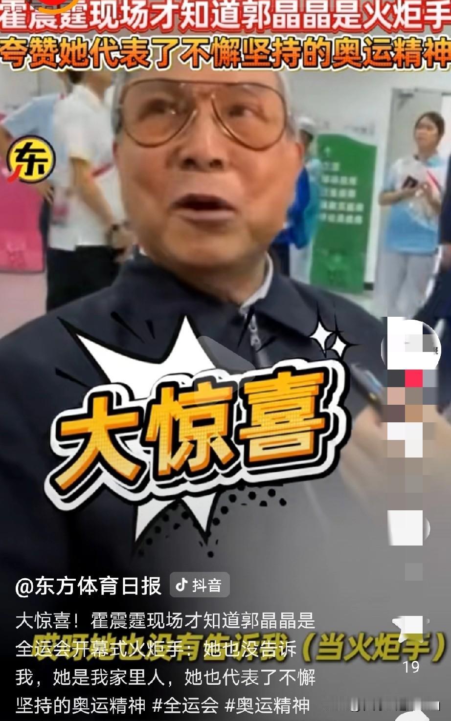 霍震霆,表情管理失败了,被网友认为,变脸太快。原因是霍震霆面对记者采访,开始严肃着一张脸,结果记者一提到郭晶晶是火炬手,霍震霆马上眉开眼笑,那份发自心底的自豪感根本掩饰不住。 当记者问他儿媳妇火炬手一事,他一开始没有听到问题时一脸严肃,记者问他对你儿媳妇当火炬手一事时,问题都没有问完他就笑了裂开了嘴,然后就很自豪地说她要当火炬手我们都不知道 。 记者:昨天,我们看到您的儿媳妇郭晶晶作为火炬手踏水而来,那当您看到这个场景的时候,您是什么感受?” 老爷子听完之后,先是忍不住笑了露出门牙,接着他激动的表示:哈哈哈,其实她没和我说,我一开始也不知道,很惊喜,哈哈,她既是我们的家人,也代表着奥运精神,我们家族都比不上她,但我们都一样热爱体育。” 他这个变脸的速度,堪称京剧,被网友戏称,霍老爷子表情管理彻底失败。足以见得他真的很欣赏这个儿媳妇 简直竟会给他们霍家长脸。你说这样的儿媳妇谁不喜欢?谁不稀罕? 怪不得当初郭晶晶嫁给霍家时,当有人想说她攀高枝嫁入豪门时, 霍震霆当着媒体表示,感谢郭晶晶下嫁他们霍家。给了郭晶晶最大的体面。后来郭晶晶不靠霍家出名, 而是靠自己,专注自己的体育事业,成了巴黎奥运会跳水裁判,她不和阔太圈厮混,专注自己的事业,孩子也教育得很好,丈夫像她的小跟班,根本不用担心他出轨。 话说郭晶晶真的是好命人,嫁到霍家后,霍震霆不仅对其称赞有加,家族更是全力支持儿媳妇事业。