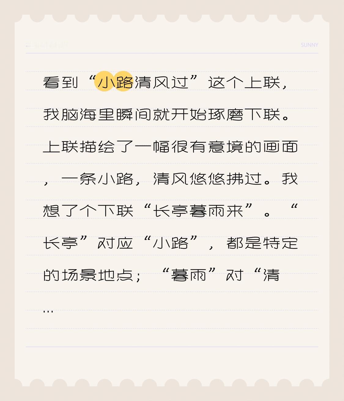 看到“小路清风过”这个上联,我脑海里瞬间就开始琢磨下联。上联描绘了一幅很有意境的画面,一条小路,清风悠悠拂过。 我想了个下联“长亭暮雨来”。“长亭”对应“小路”,都是特定的场景地点;“暮雨”对“清风”,一个是傍晚的雨,一个是清爽的风,很搭;“来”对“过”,动词相对。想象一下,一边是小路上清风拂过,一边是长亭处暮雨飘来,画面感直接拉满,是不是还挺有韵味的?
