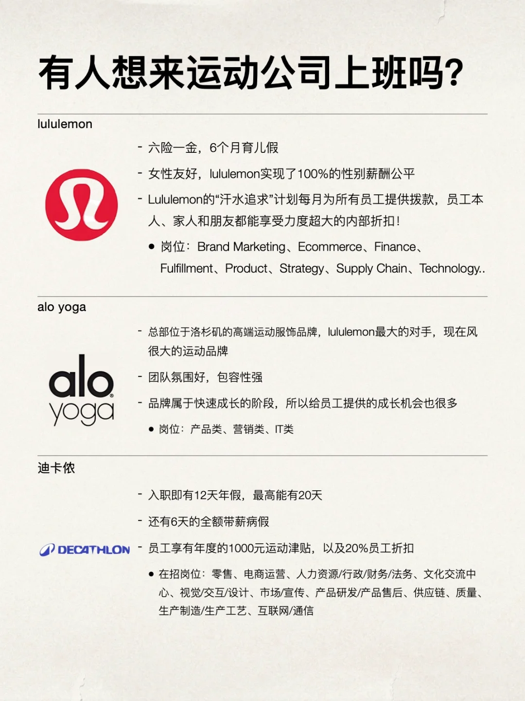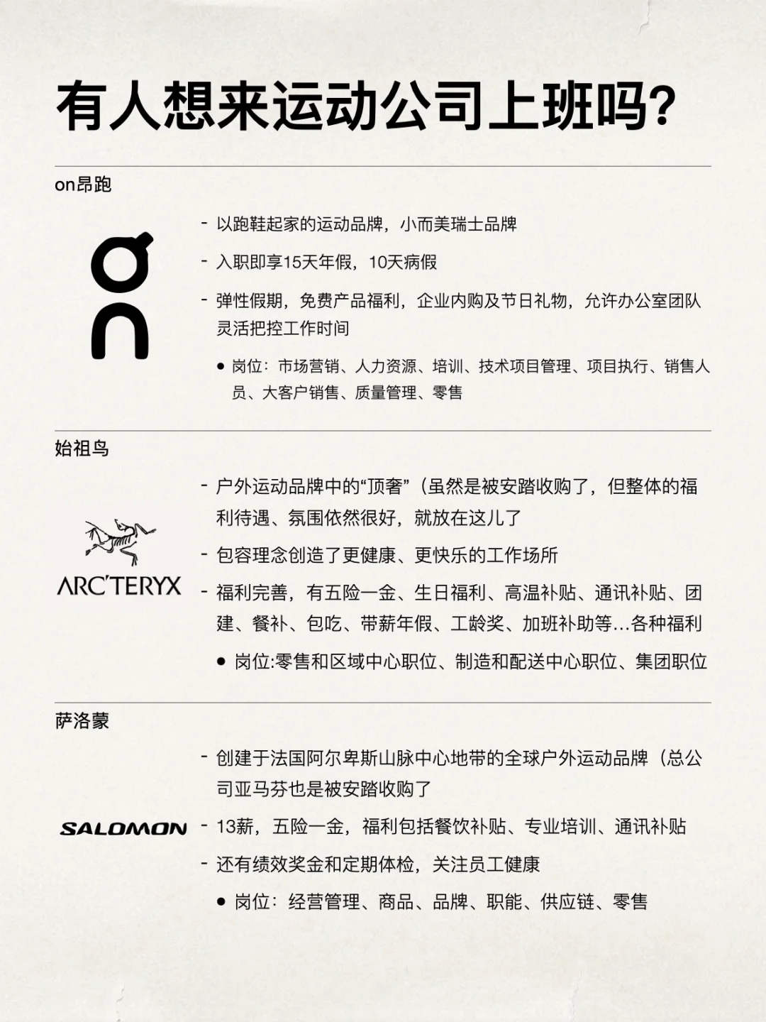 这次整理的有做装备的,有做鞋服的,也有做运动科技的,岗位类型也比较多:运营、市场、设计、供应链、客服、行政……所以并不是只有体育生才能去,其他相关的也完全能转。