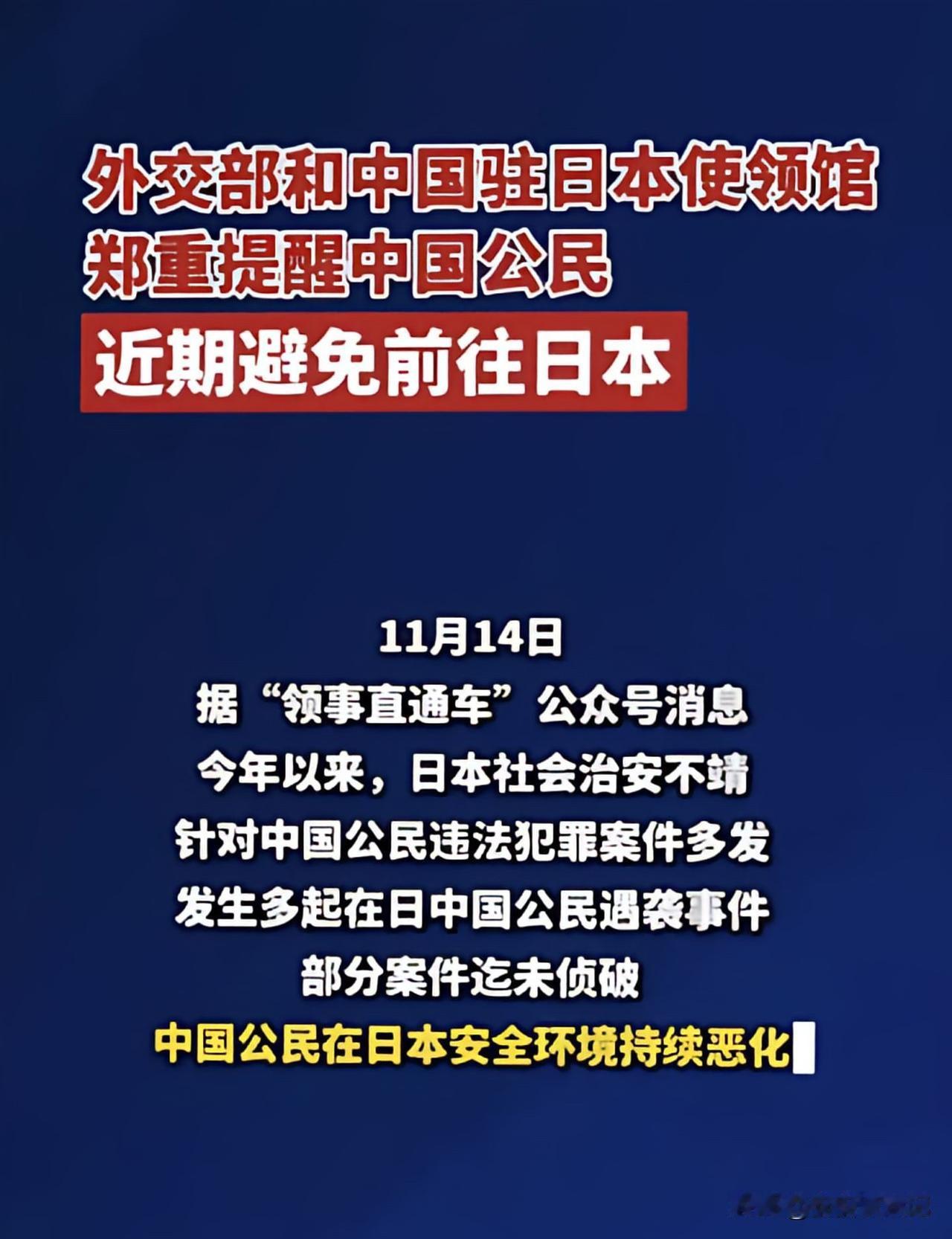 外交部和驻日使馆提醒近期别去日本,这提醒可不是空穴来风。今年日本社会治安差,针对咱中国公民的违法犯罪案件一个接一个,好多在日中国公民遇袭,有些案子到现在都没破,安全环境越来越糟心。 更过分的是,日本领导人还公然发表涉台挑衅言论,让中日人员交流氛围变得特别差,在日中国公民的人身安全都受到重大威胁。咱可得把这提醒当回事儿,近期就别往日本跑了。在日本的同胞也得时刻留意治安,加强自我保护,遇到紧急情况赶紧报警,也别忘了联系咱的使领馆。