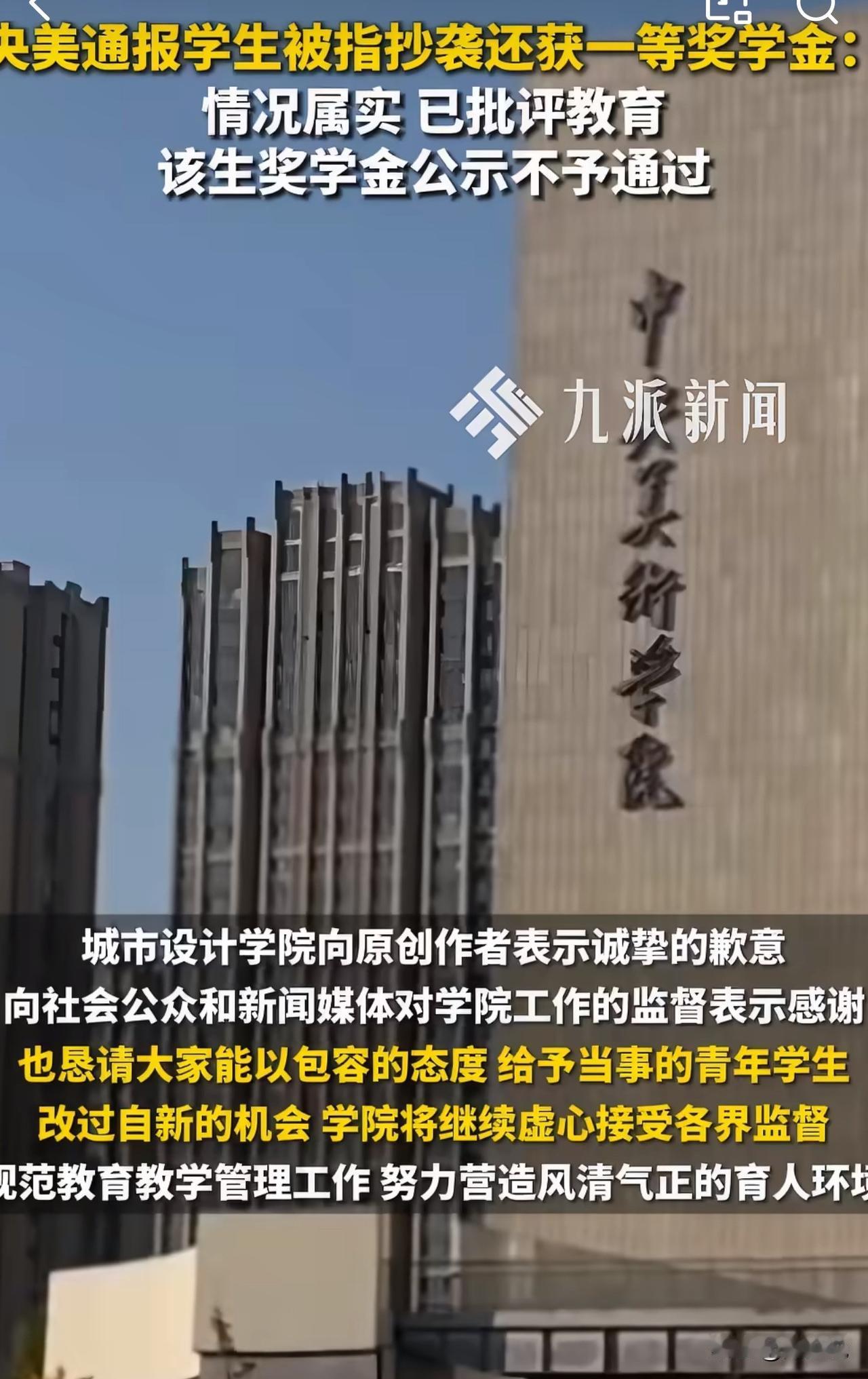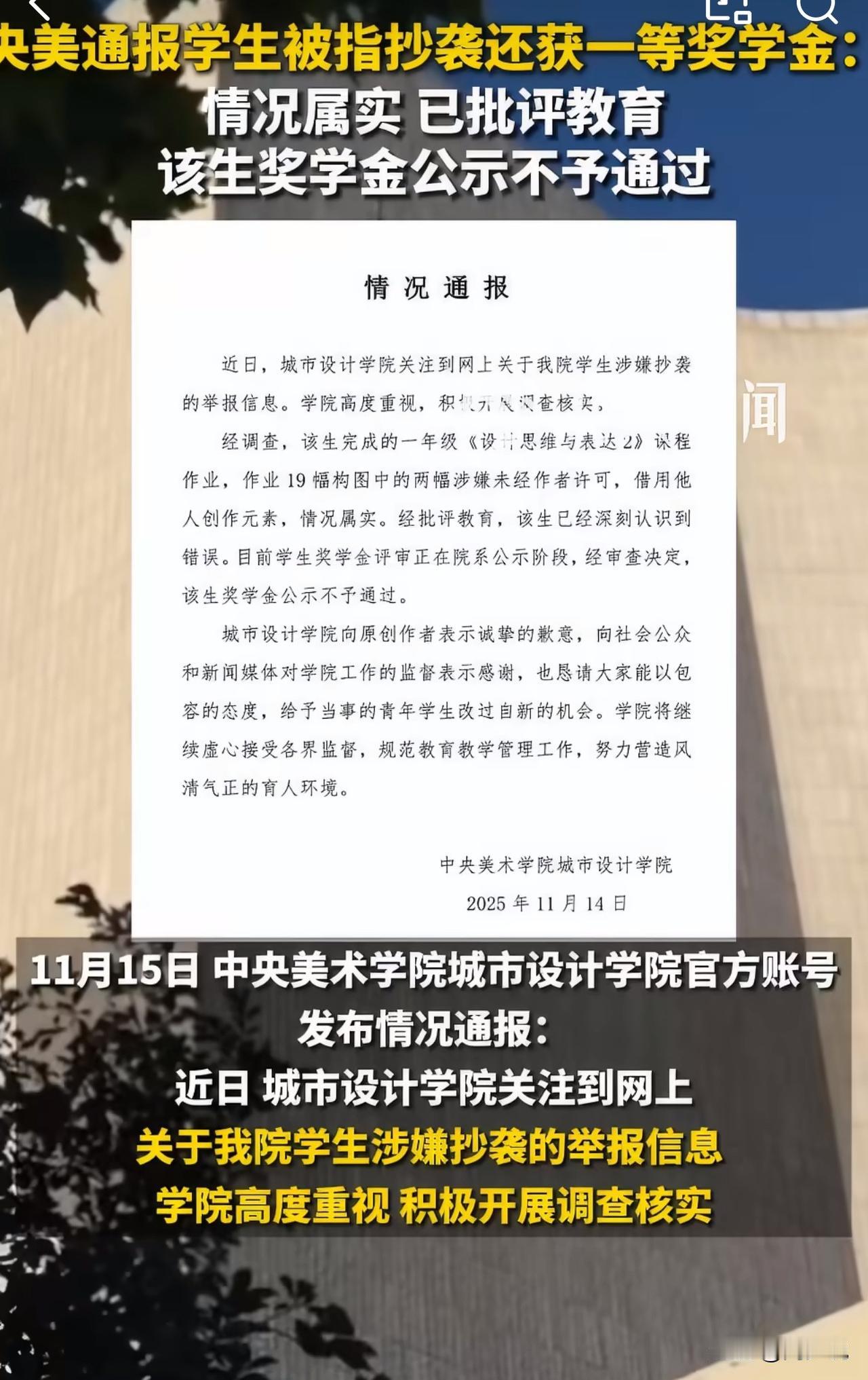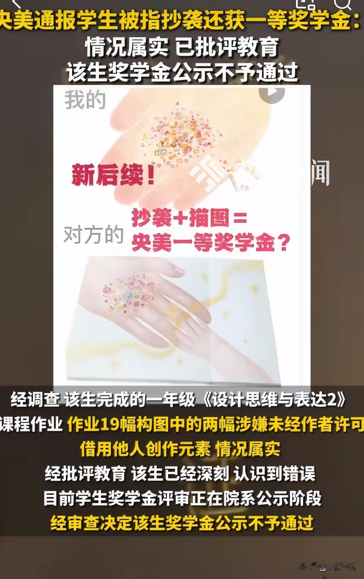 #中央美术学院通报一学生涉嫌抄袭#央美又爆大瓜!城市设计学院一名学生,因课程作业抄袭被原作者举报,最终不仅挨了批,连公示中的奖学金也被直接撤销! 11月14日,学院通报核实:该生《设计思维与表达2》作业里,19幅构图有两幅涉嫌未经许可盗用他人创作元素,情况属实。 经批评教育后,学生已深刻认错,学院随即决定不予通过其奖学金公示,同时向原创作者诚恳致歉,并恳请公众包容,给学生改过自新的机会。 此事引发网友热议,有网友说:“艺术圈最忌抄袭,取消奖学金是应有之义,没开除都算留情了!” 也有网友称:“知错能改是好事,但包容不代表纵容,得让他记住这个教训!” 还有网友表示:“学院处理够快也够明确,守住了艺术教育的底线!” 在艺术领域,原创是立身之本。周少觉得这名学生的行为,既辜负了教育培养,也践踏了创作尊严,更是给央美抹黑了。 学院及时亮剑、取消奖学金,是对原创的敬畏,也是对所有学子的警示,才华可以打磨,但品行不能有亏。给知错者改过机会值得肯定,但更要让每一位创作者明白:抄袭之路,从来走不远。#寻美三湘# #MCN双量进阶计划#