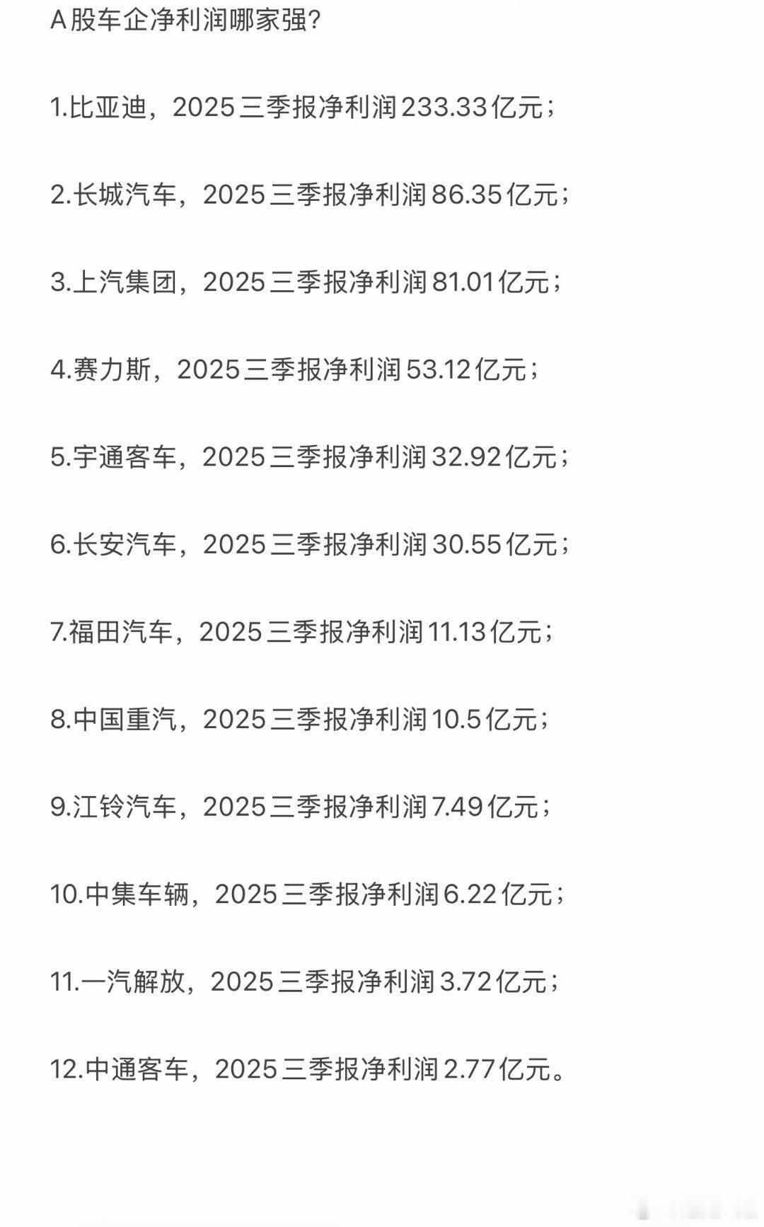 谁才是真正的“赚钱王者”?看完数据直接惊了!比亚迪以233.33亿元三季报净利润断层领跑,比第二名到第四名加起来还多!长城、上汽紧随其后,但差距肉眼可见;赛力斯53亿+跻身前四,新能源赛道爆发力太猛。而榜单后半段,从宇通的32亿到中通的2.77亿,车企盈利分化越来越明显。有人躺赢,有人挣扎,2025年的车市“钱景”,全在这组数据里了!