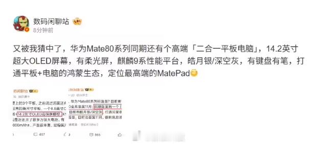 【,麒麟 9 系性能平台 】博主 今日爆料称,华为 Mate80 系列同期还有个高端「二合一平板电脑」,14.2 英寸超大 OLED 屏幕,有柔光屏,麒麟 9 系性能平台,皓月银 / 深空灰,有键盘有笔,打通平板 + 电脑的鸿蒙生态,定位最高端的 MatePad。 目前,官方暂未公布以上新品的具体发布时间。