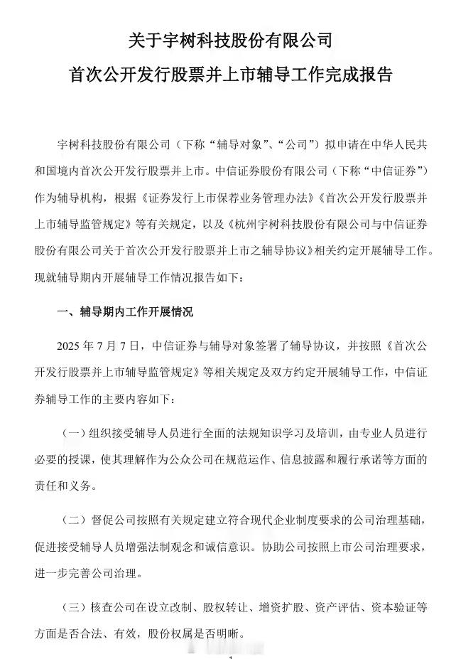【,拟境内首次公开发行股票并上市】中国证监会官网今日显示,宇树科技已发布 IPO 辅导工作完成报告,拟申请在中华人民共和国境内首次公开发行股票并上市。宇树科技今年 7 月开启上市辅导,由中信证券担任辅导机构。