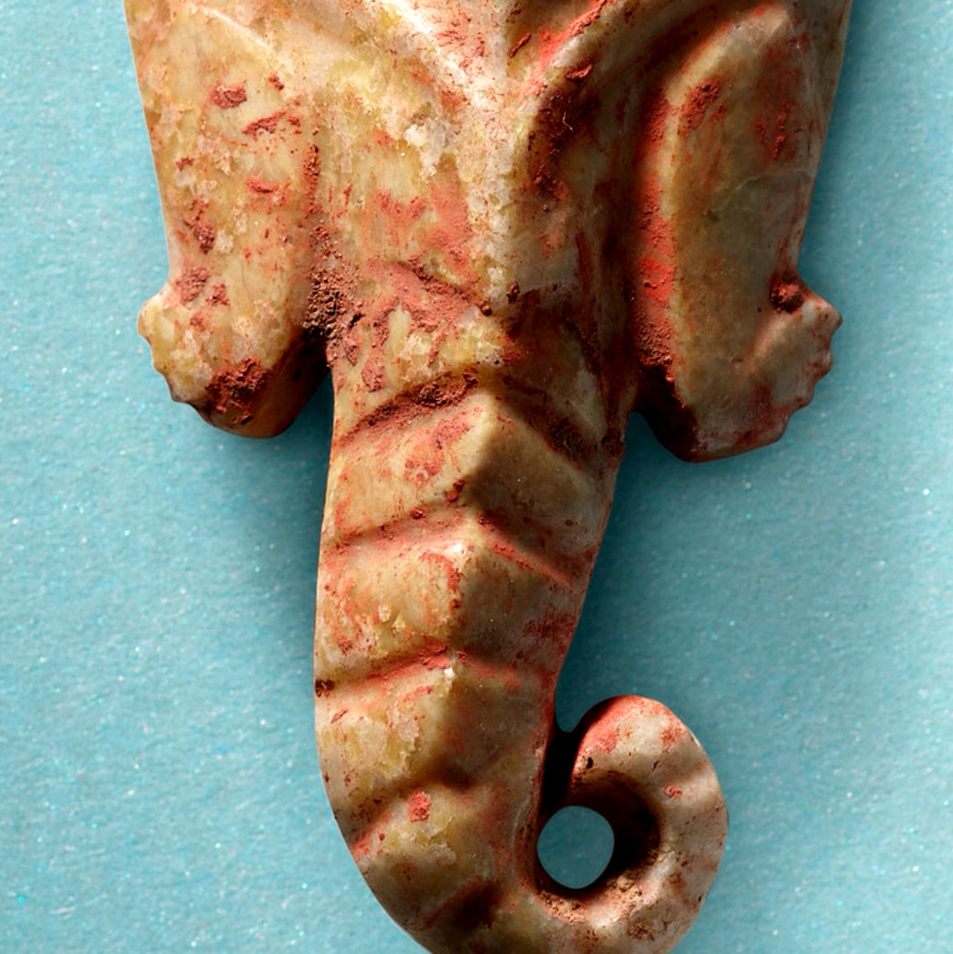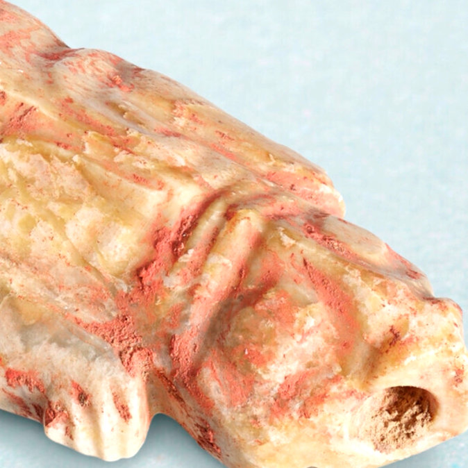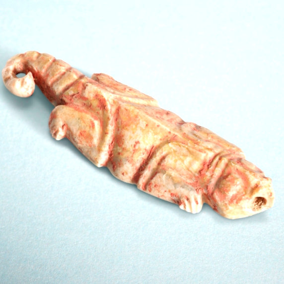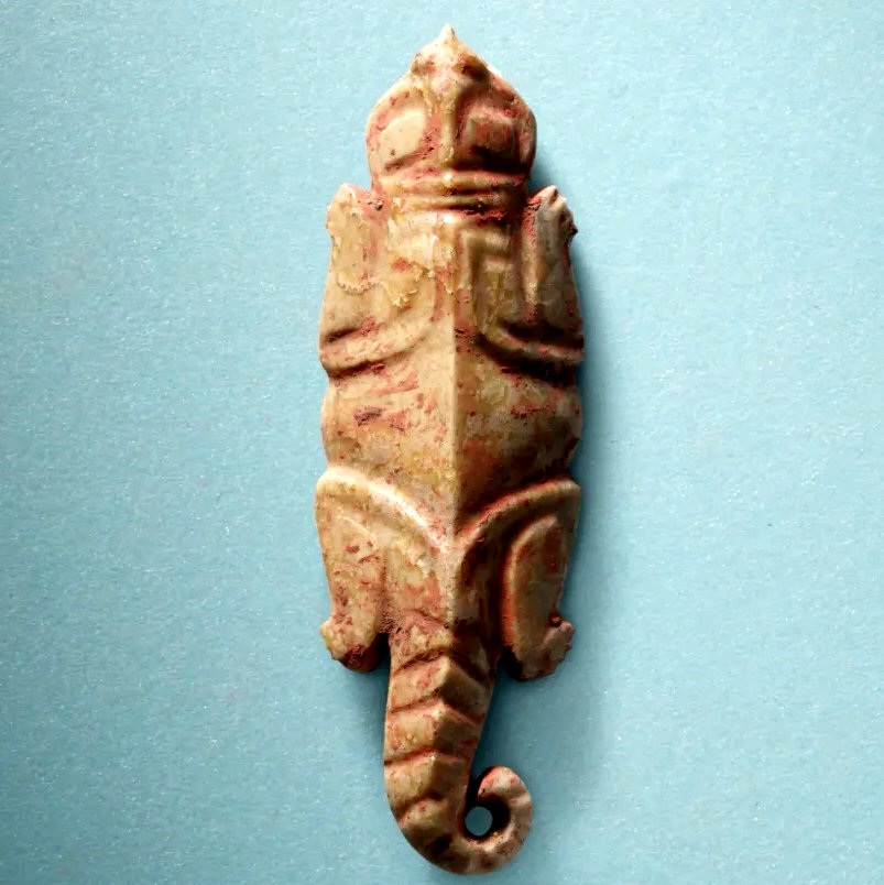 “蝾螈”这种叫法是文学语言,其实就像我们上海“四脚蛇”一样一样的。这件“蝾螈”全身鸡骨白的,还是生坑,沾有红色的山泥,属商晚期之遗物。