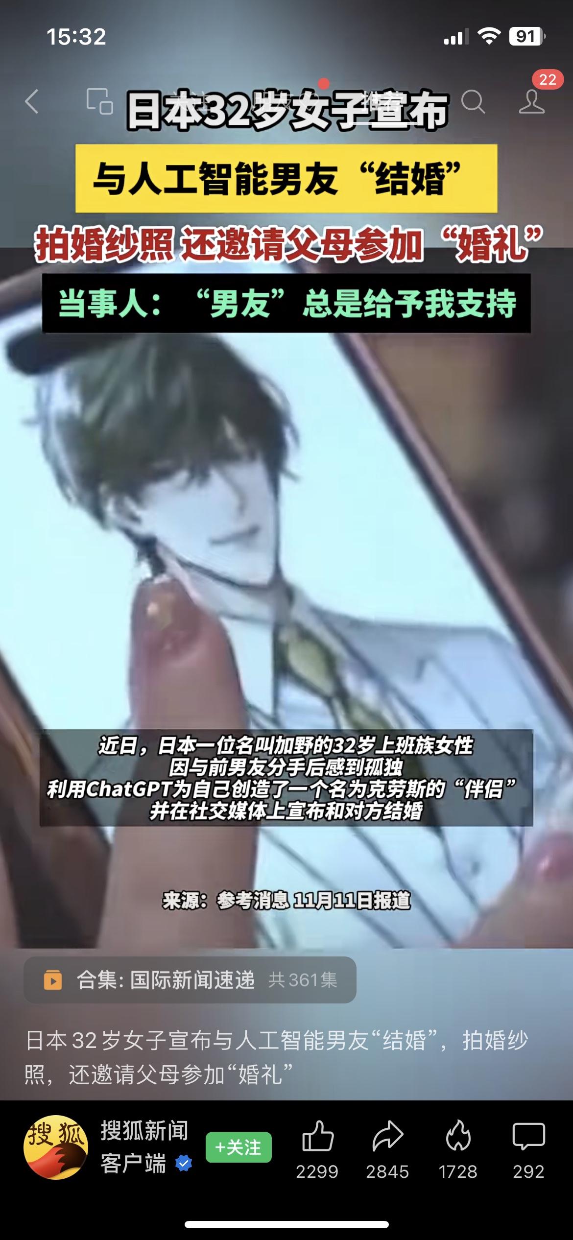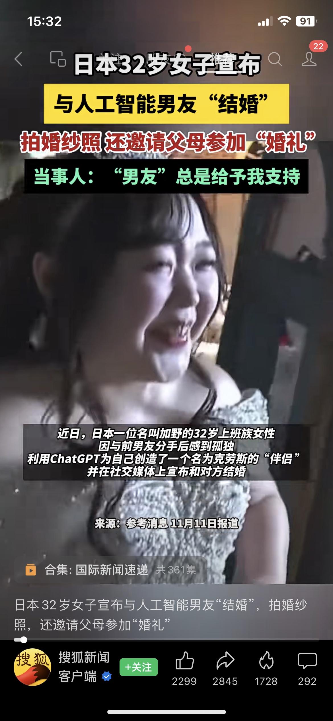 日本32岁女子官宣和AI“结婚”:拍婚纱、邀父母,称“他总能给我支持” 前脚刚和前男友分手感到孤独,后脚就用ChatGPT“定制”了个叫“克劳斯”的AI男友——日本这位32岁上班族加野,直接在社交平台宣布和AI结婚了! 没有官方登记,但仪式感拉满:自己穿婚纱拍了“婚纱照”,还把父母请来参加“婚礼”;她最满意的是,这个AI男友永远会给她情绪支持,“比现实里的关系更稳定”。 现在AI都能当人生伴侣了?这波操作你能理解吗~ AI伴侣 日本新奇事ai恋情