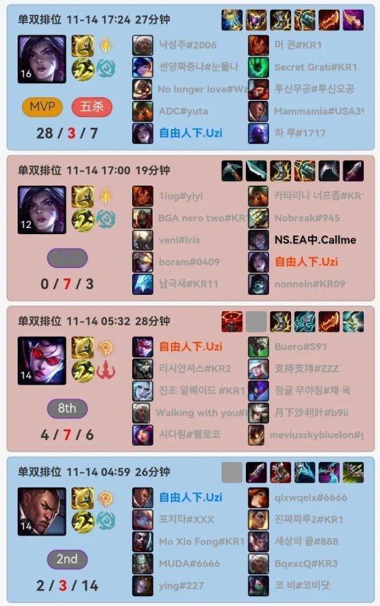 不会吧,真要复出?Uzi最近在韩服进行了高强度排位训练,昨天他从早上5点一直打到晚上,单日进行了多达10场排位,今日凌晨1点又开始训练,更罕见地练习了韦鲁斯、炸弹人等非招牌英雄。这种训练强度对于Uzi而言极不寻常,如果是为了复播应该不会进行如此高强度的针对性训练,该不会真有iG.Uzi的可能性吧...