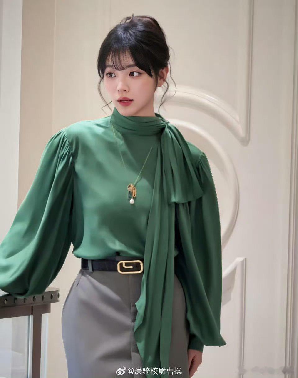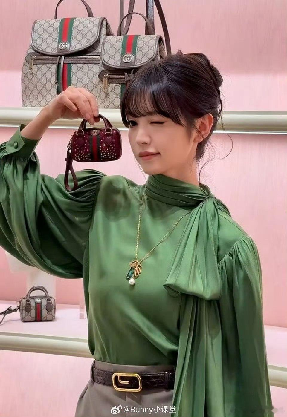 田曦薇Gucci线下活动,绿色上衣和齐刘海丸子头好可爱的小田