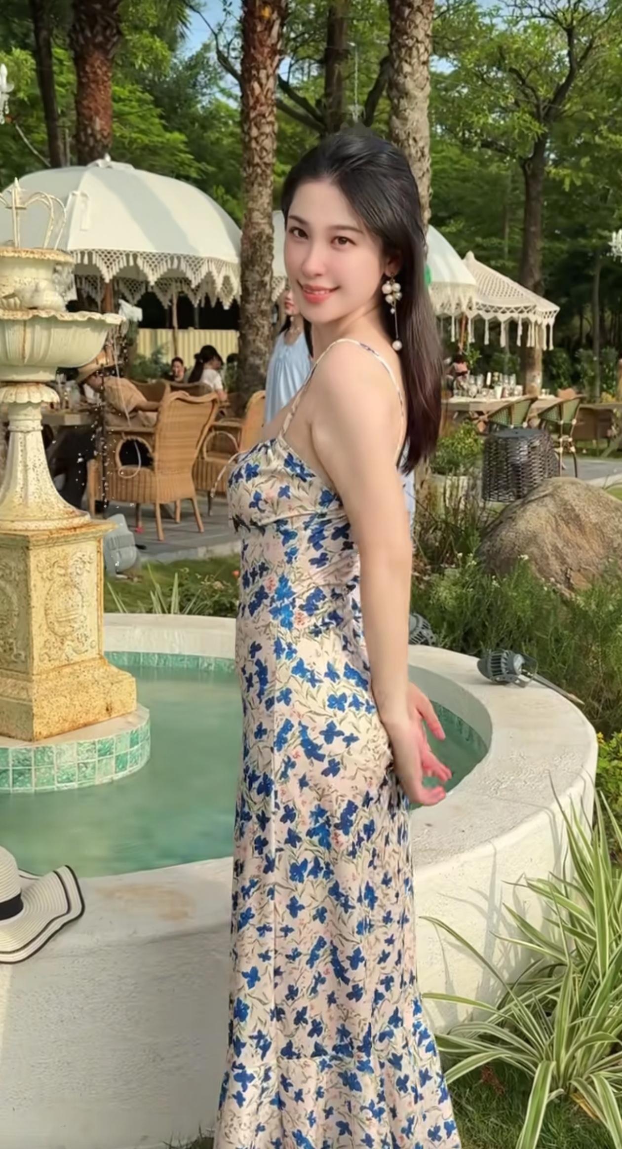 夏日花园中的优雅时光,蓝白相间的连衣裙,与自然美景相得益彰。