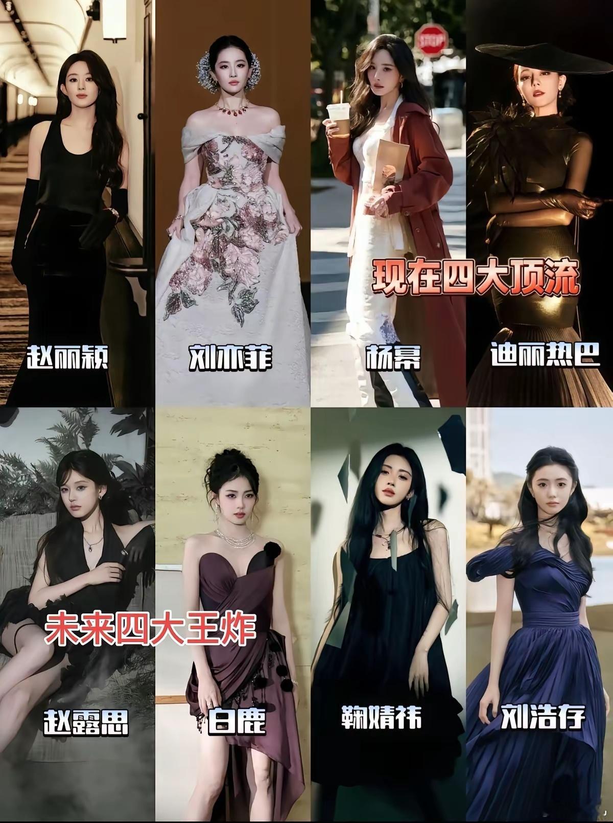 现在四大顶流赵丽颖,刘亦菲,杨幂,迪丽热巴和未来四大王炸赵露思,白鹿,鞠婧祎,刘