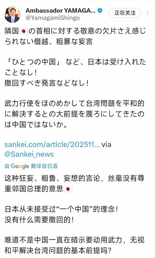 这一位外交官竟然要撼动中日建交的基础,委实让人笑掉大牙了。日驻澳大使山上信吾发文表示,日本从未接受过‘一个中国’的理念! 这话一出来,不少人都看乐了——一个外交官敢这么说,怕不是忘了中日建交的底子是啥,这哪是挑战,简直是闹笑话。 先说说这事儿的具体情况。11月12号,山上信吾在澳大利亚一家媒体上发表文章,里面明晃晃写着“日本从未接受‘一个中国’原则”,还扯着“维护地区稳定”的幌子,暗戳戳提了不少不该提的话题。 要知道,中日能在1972年建交,靠的就是《中日联合声明》,里面白纸黑字写着日本政府承认中华人民共和国政府是代表中国的唯一合法政府,充分理解和尊重中国政府关于台湾是中国不可分割一部分的立场。 这可是中日关系的根基,相当于盖房子的地基,现在他说没接受,那不就是想把地基刨了? 更有意思的是,日本官方的态度跟他还不一样。这文章发出来没两天,日本外务省就赶紧出来“灭火”,说山上信吾的言论“不代表日本政府立场”,还强调日本一直遵循《中日联合声明》里的原则。 你说这事儿逗不逗?一个大使公开说的话,政府扭头就不认,要么是他自己拎不清,要么就是日本内部在这事儿上没拧成一股绳。 咱们再往深了想,山上信吾为啥这会儿跳出来说这话?结合最近的情况看,澳大利亚跟日本走得挺近,又是搞军事合作,又是在地区事务上互相搭台。 他在澳大利亚的媒体上发这种文,说不定是想讨好澳大利亚,同时跟某些势力表个态。 还有个点得提一提,2024年5月的时候,日本首相访华,当时还特意强调要“维护中日关系政治基础”,说要遵守双方达成的各项共识。 这才过去半年多,就有大使出来唱反调,这前后反差也太大了。要是日本真把“政治基础”当回事,就该好好管管自己的外交官,别让他们乱说话,不然之前的努力不都白费了? 可能有朋友会问,这事儿对咱们影响大吗?其实真不用太在意。“一个中国”原则是国际社会公认的,联合国都承认,全世界180多个国家跟咱们建交,都接受这个原则。 日本当年建交的时候也白纸黑字签了字,现在一个大使随便说说,就能把事实改了?根本不可能。而且咱们外交部也已经表态了,要求日本政府纠正错误,维护中日关系根基。这态度很明确,想在这事儿上搞小动作,门儿都没有。 说句实在的,山上信吾这波操作,更像是给自己找不痛快。作为外交官,最基本的就是搞清楚自己国家的外交立场,尊重历史协议。 他倒好,反过来挑战自己国家签的声明,这不是专业能力有问题,就是故意找茬。要是日本政府真纵容这种行为,那中日之间想好好合作,可就更难了。 追根溯源,此事不过是一位行事欠专业的外交官,道出一段有悖历史真相之言论,最终令其所在国家陷入窘迫境地,着实令人唏嘘。 中日关系要想好好发展,靠的不是嘴硬,而是尊重历史、遵守共识。若有人执意于“一个中国”原则上蓄意生事、妄图挑衅,最终不过是自不量力。这般行径恰似搬起石头,最终必将重重砸向自己,自食恶果。 毕竟历史事实摆在那儿,不是谁随便说两句就能改变的,希望日本能早点认清这一点,别再干这种自欺欺人的事儿了。 信息来源: 网易新闻——2025-11-15 狂妄至极!日本大使:从未接受过“一个中国”政策,不需要撤回 观察者网——2023-1-11日 驻澳大使扬言要“警惕中国”,我大使反击:日本至今未就二战中的罪行向澳道歉,“历史可能重演”