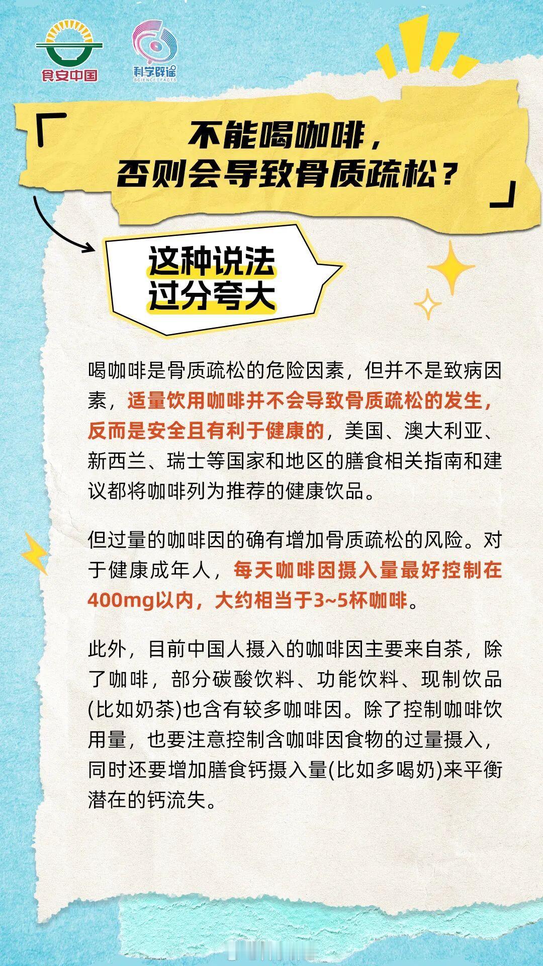 【不能喝咖啡否则会导致骨质疏松?】这种说法过分夸大!喝咖啡是骨质疏松的危险因素,但并不是致病因素,适量饮用咖啡并不会导致骨质疏松的发生,反而是安全且有利于健康的,美国、澳大利亚、新西兰、瑞士等国家和地区的膳食相关指南和建议都将咖啡列为推荐的健康饮品。