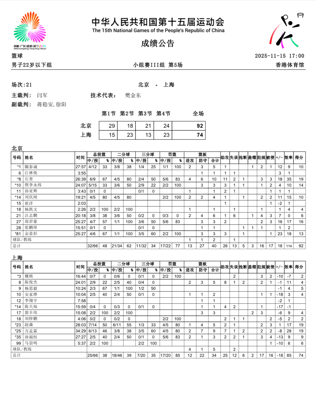北京U22击败上海,以小组第一晋级八强,石奎拿到19+11+10的三双数据!